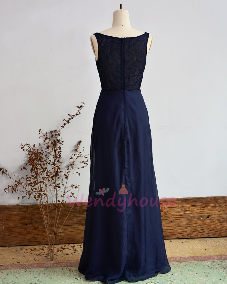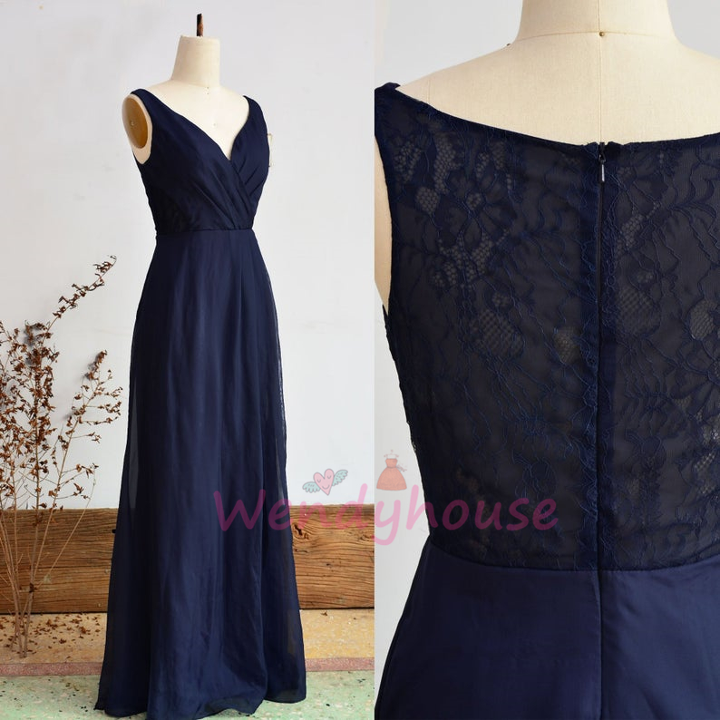 Navy blue chiffon bridsmaid dress in floor length long, comes with v neckkline and lace up back details.