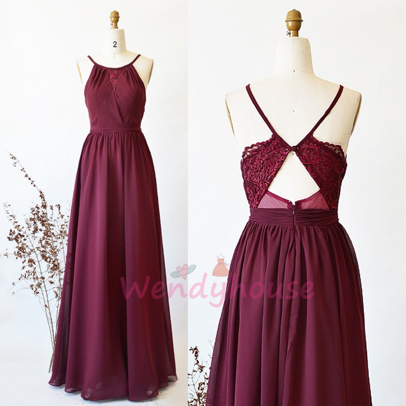 Scoop neckline burgunyd chiffon long bridesmaid dress.