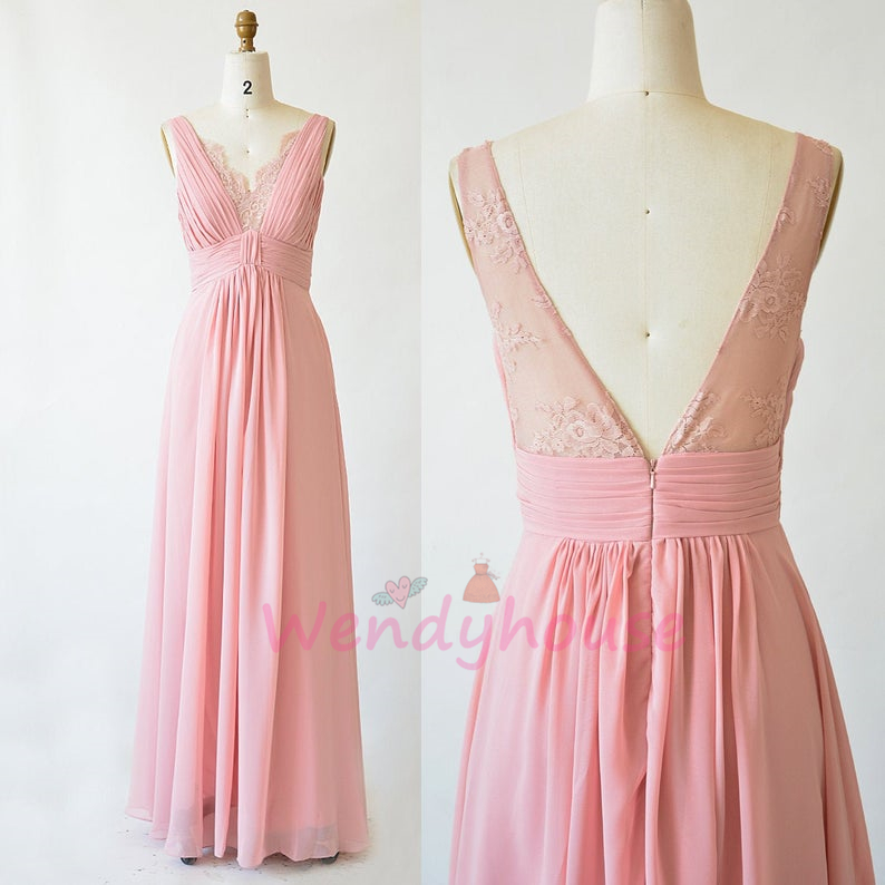 V Neck Pink Chiffon Long Bridesmaid Dress