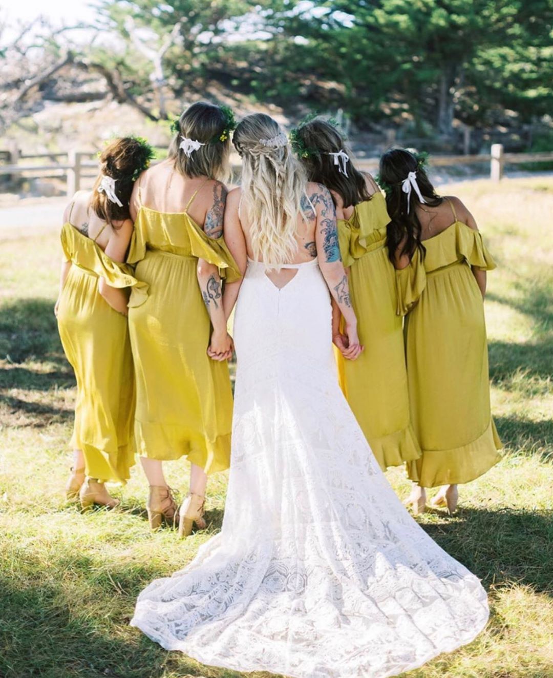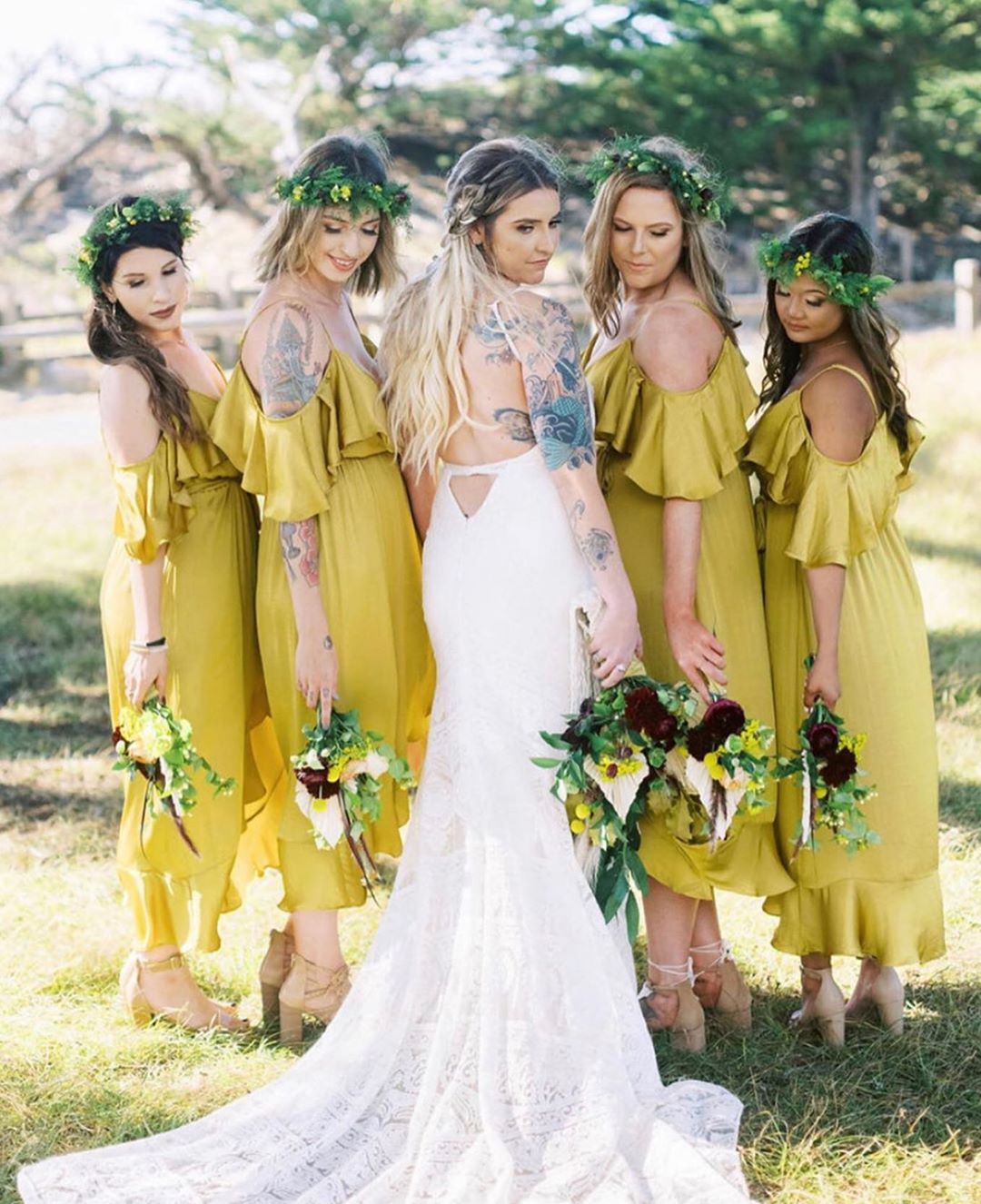 Flowy summer long bridesmaid dress with cold sleeves, wrap front.