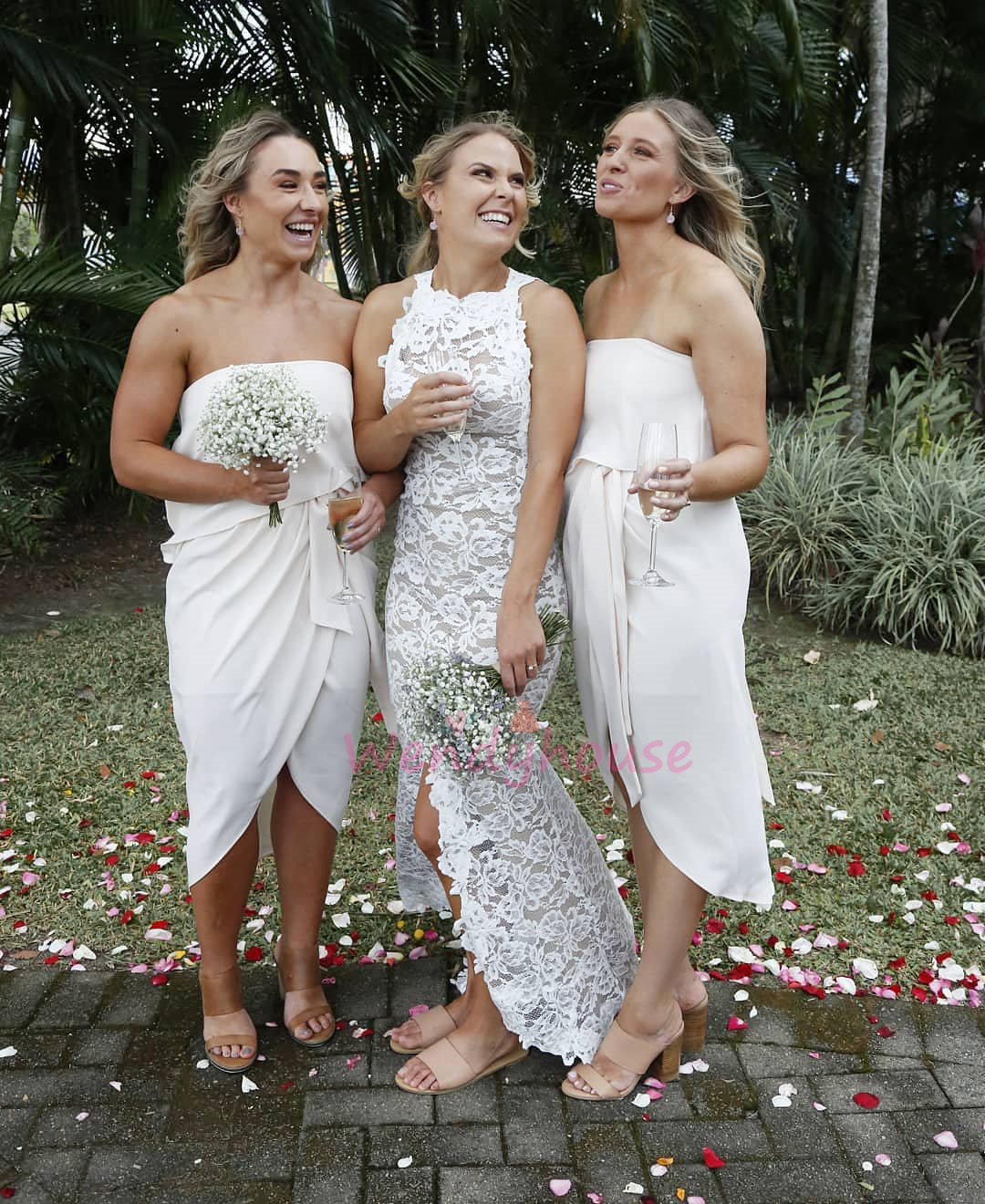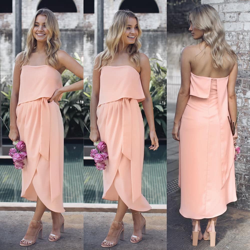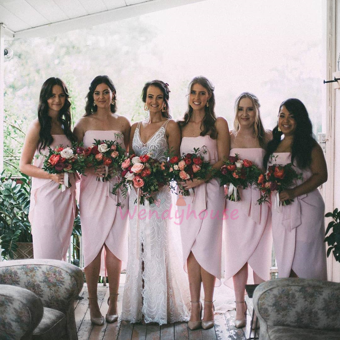 Strapless Pink Chiffon Midi Bridesmaid Dress