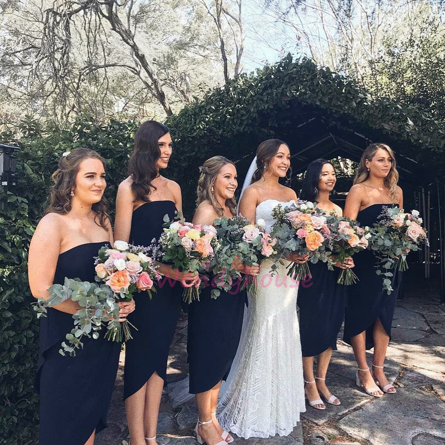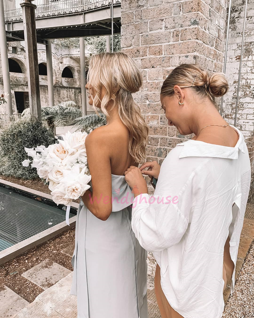 Pink chiffon midi bridesmaid dress features with strapless neckline, midi wrap skirt and tie sash, zip up back design. More colors are available. Just email me what color and size you want!