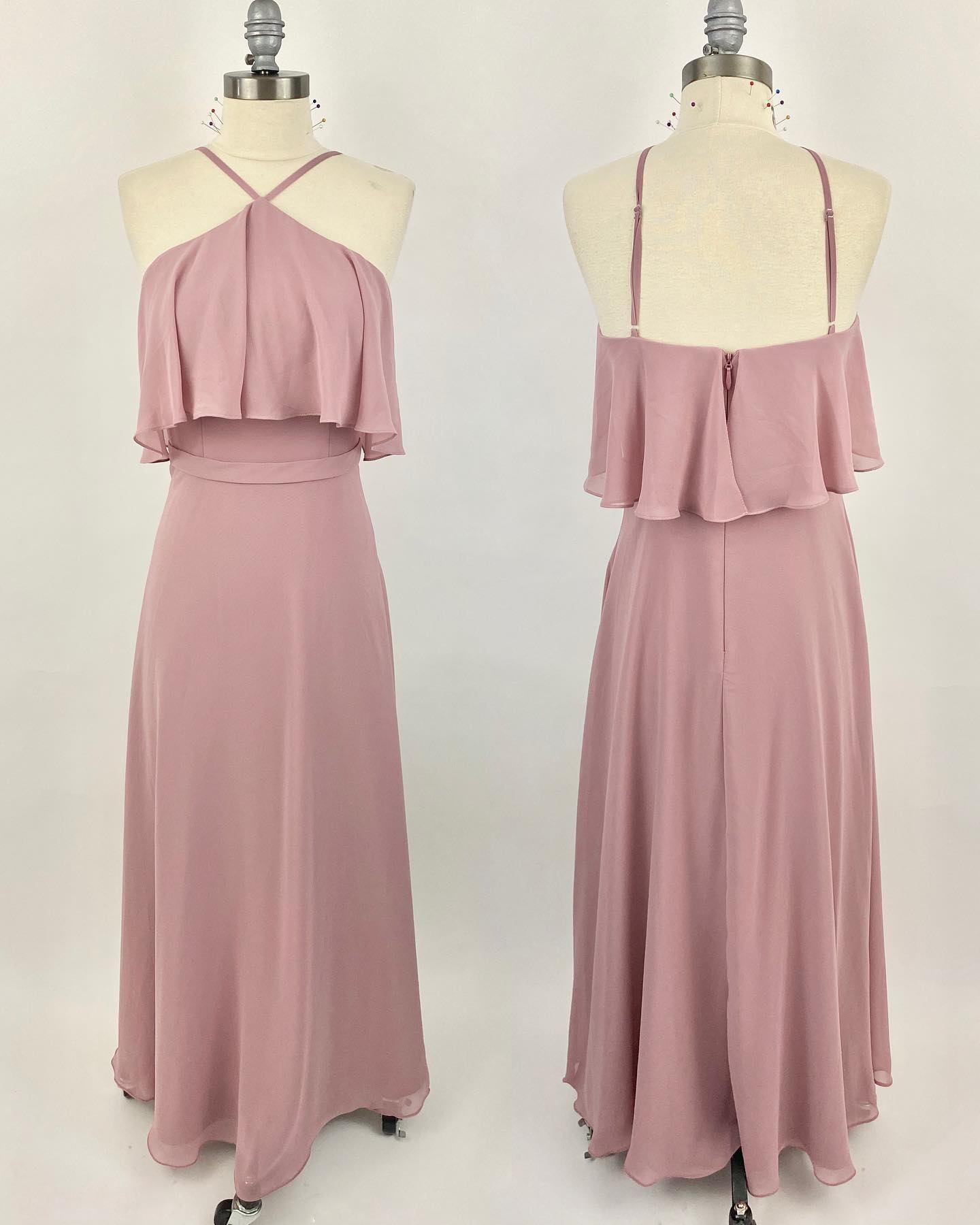Wendyhouse halter blush pink chiffon long bridesmaid dress with halter neck, ruffles and zip up back.