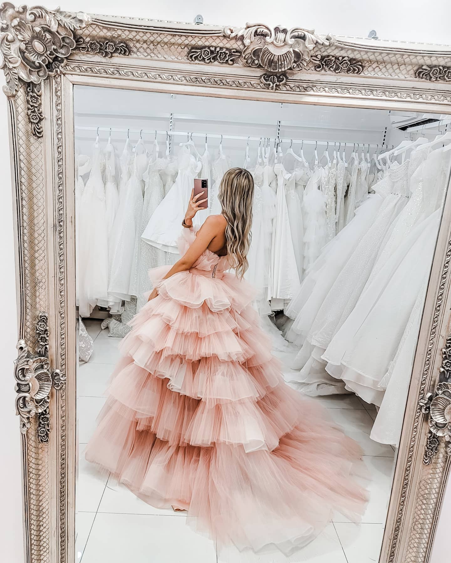 Wendyhouse princess pink long ball gown features with strapless neck,ruffles, lace up and sweep train in the back. .