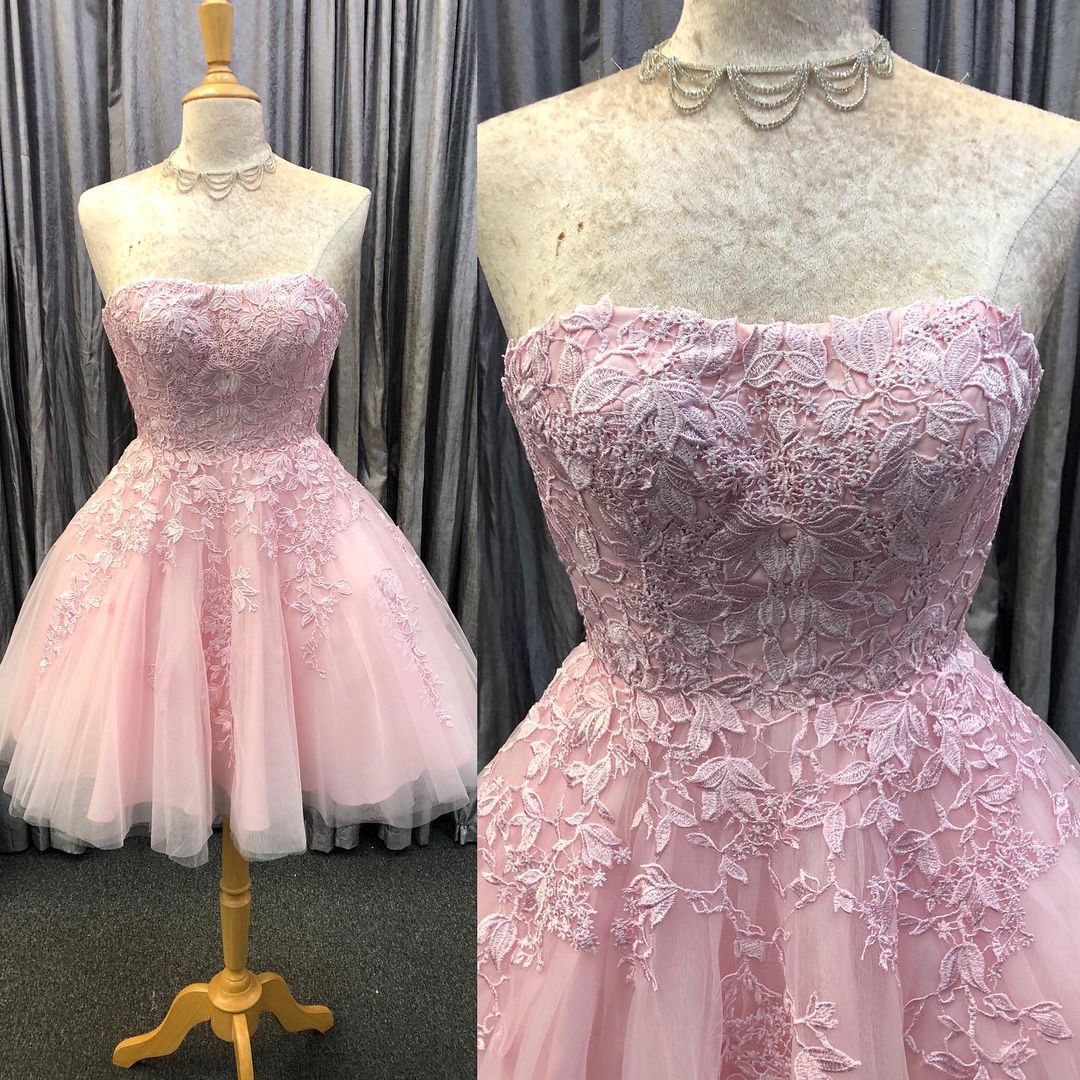 Wendyhouse short A-line pink homecoming dress features with strapless neckline and lace appliques.