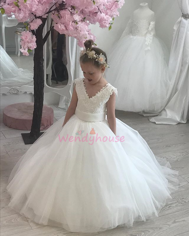A-line tulle long flower girl dress with v neckline, lace appliques top and tuppy tulle skirt. We add underling to make sure it is comfortable to wear.