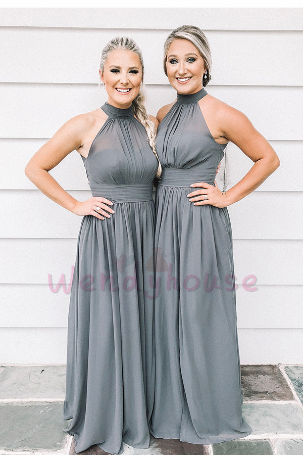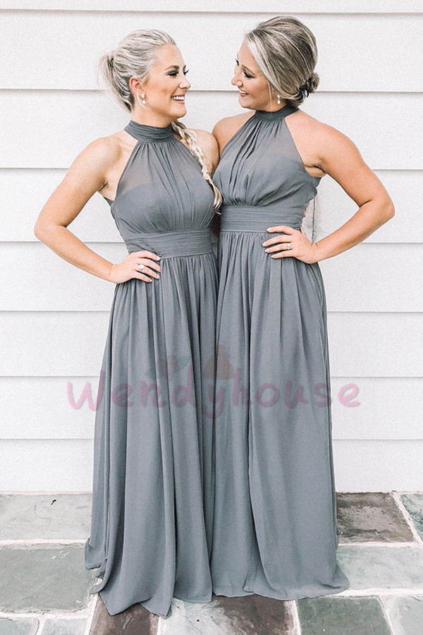 High Neck Grey Chiffon Long Bridesmaid Dress