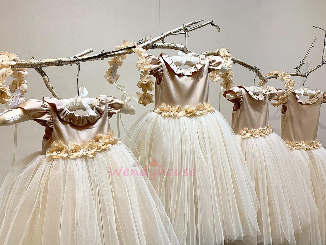 Champagne long flower girl dress combines with satin top and tulle skirt. The flutter sleeve is quite adorable.