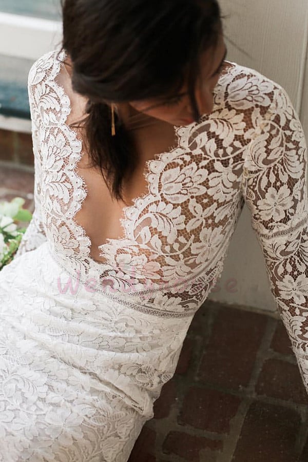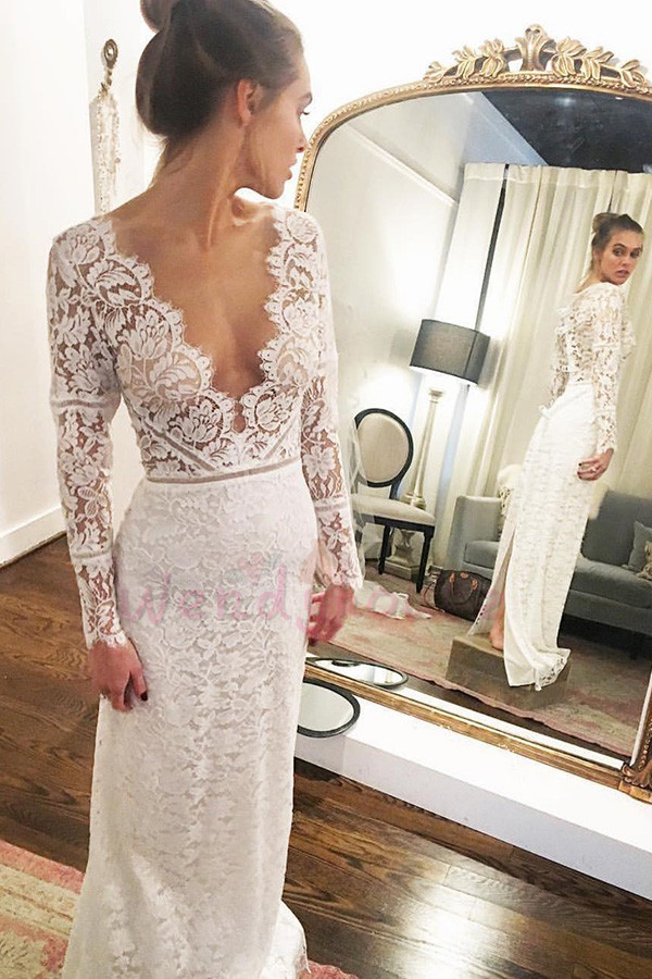 Deep V Neck Long Sleeves Lace Long Bridal Dress