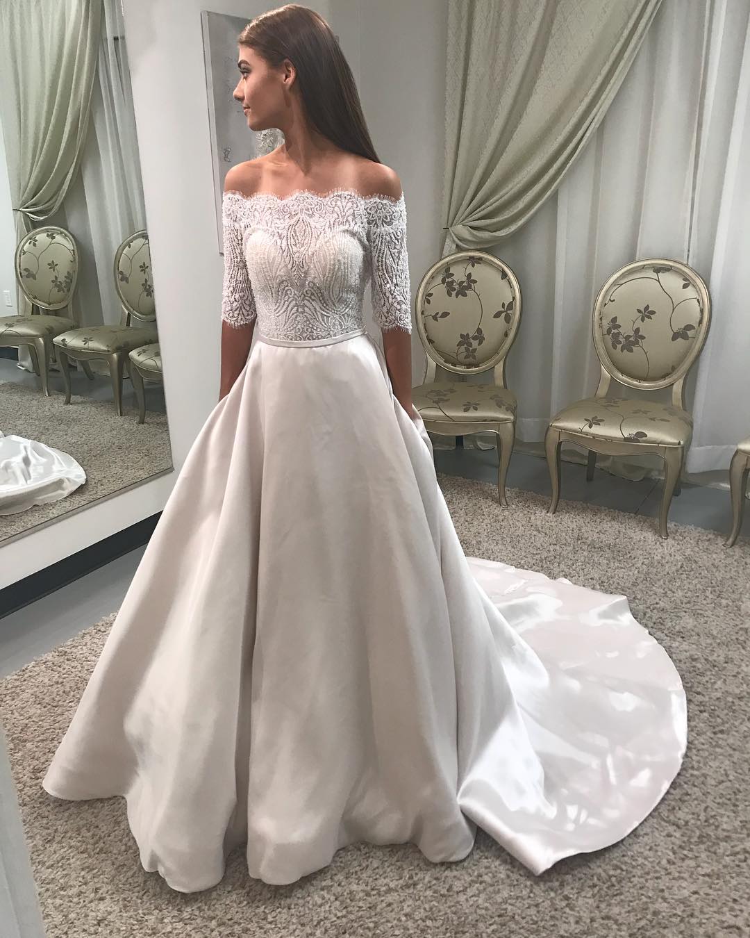 Off the Shoulder Wedding Dress, Ivory Long Wedding Dress with Train, Party Dress