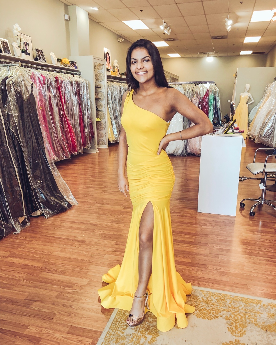 One Shoulder Prom Dress, Mermaid Long Prom Dress, Yellow Prom Dress with Slit