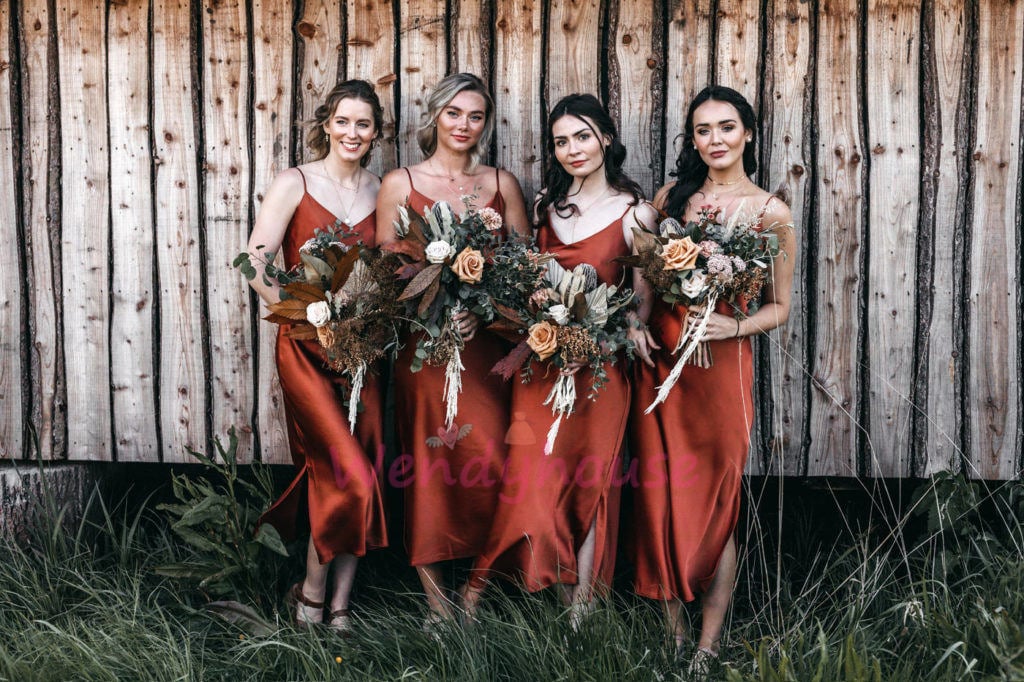 Rust orange slip bridesmaid dress features with spaghetti straps and side slit.