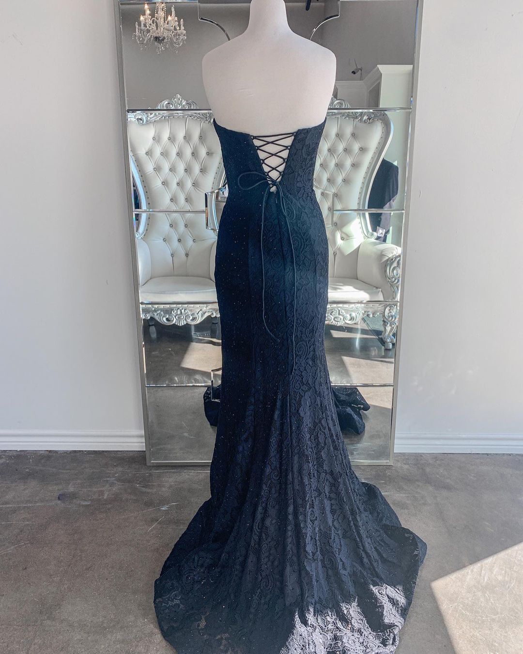 Wendyhouse black lace mermaid long evening dress with strapless and side slit.
