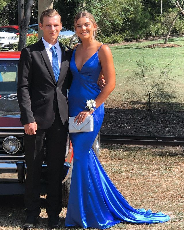 Wendyhouse elegant royal blue long formal dress with plunge neckline and open back.