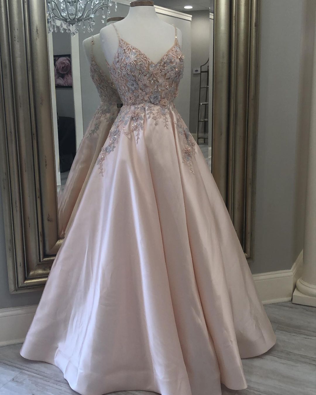 Wendyhouse elagant A-line pink satin long formal dress prom dress with modest v neck and spaghetti straps.