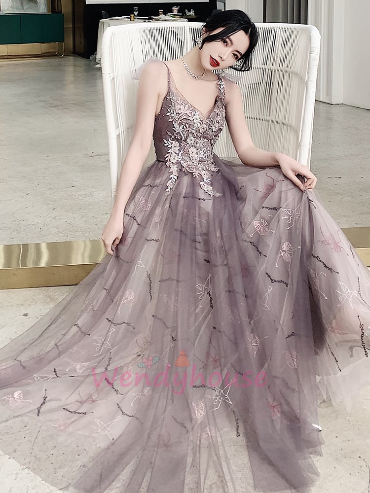 Wendyhouse A-line purple long formal dress with classic v neck and floral embroidery and zip up back.