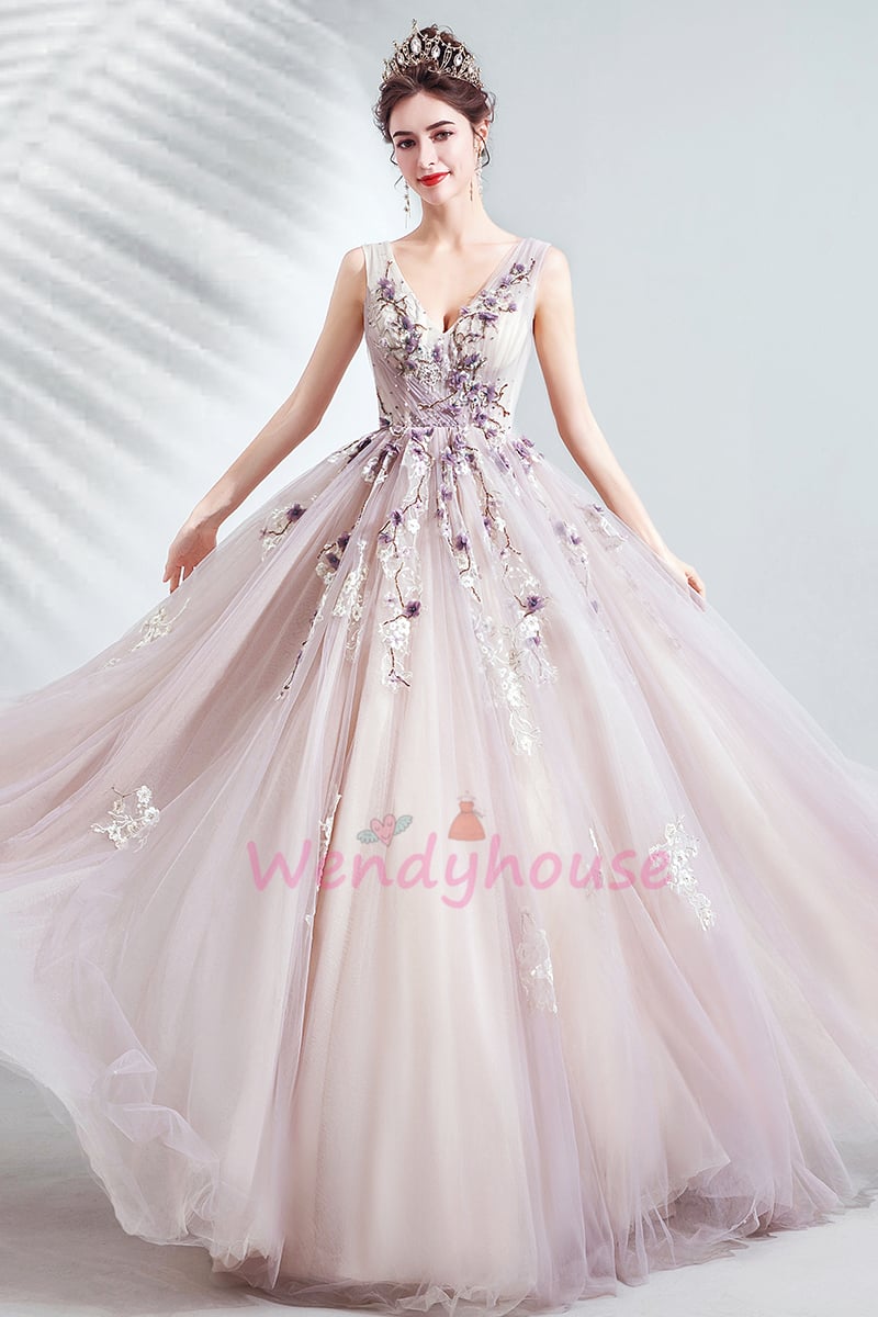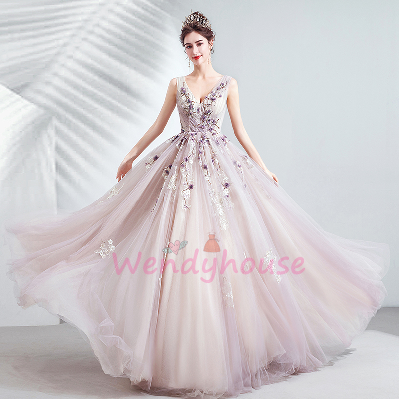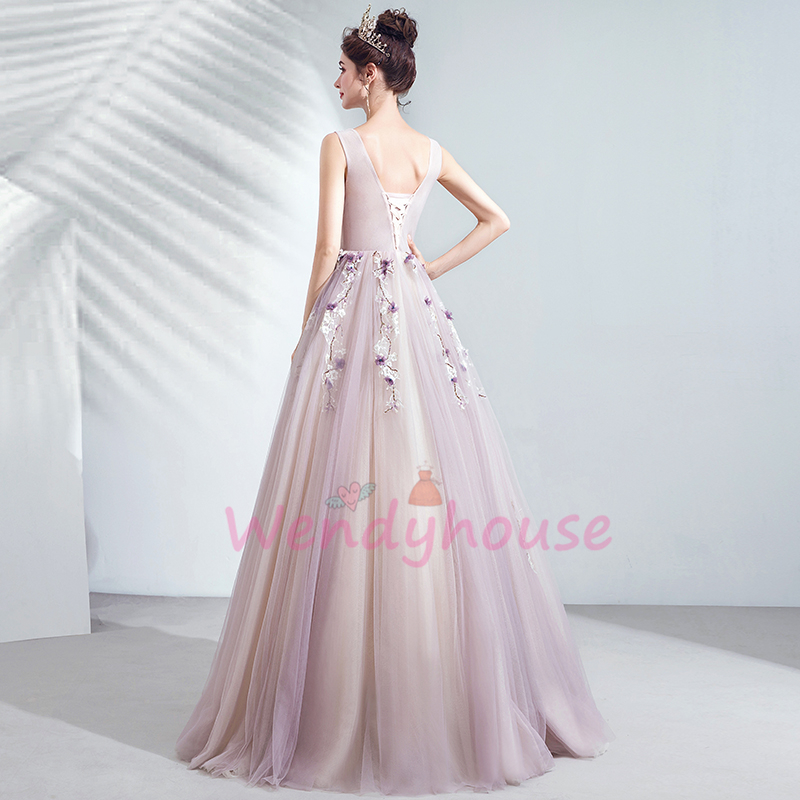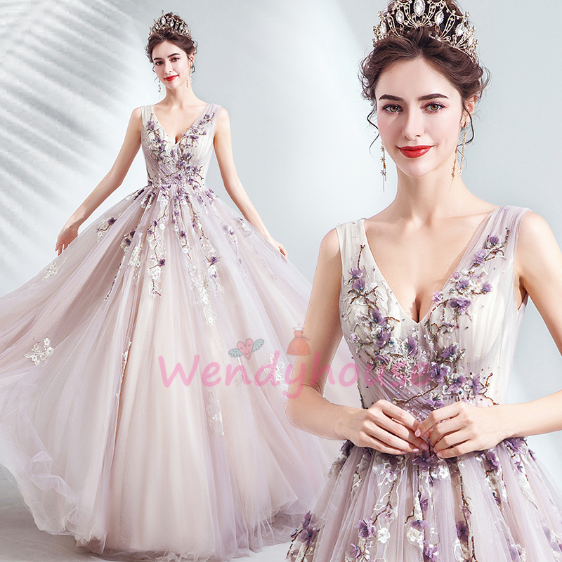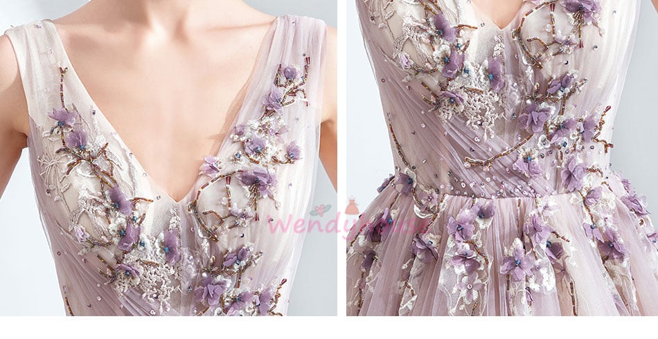 Wendyhouse beautiful A-line purple long prom dress with v neckline, floral appliques and lace up back.