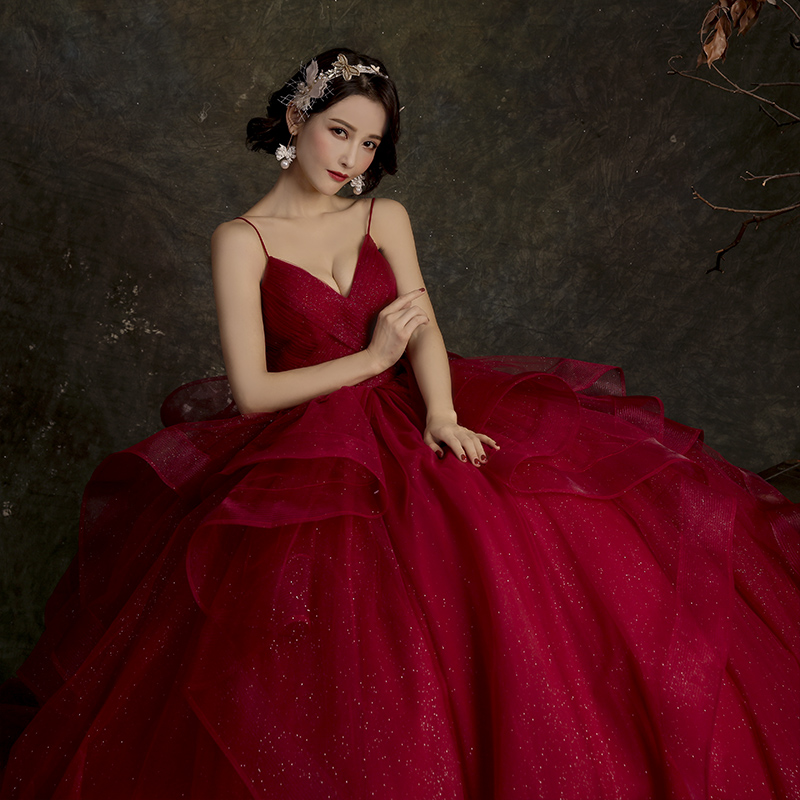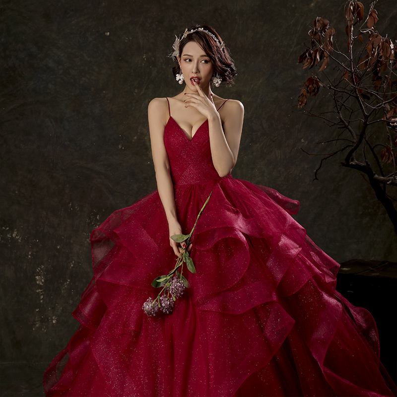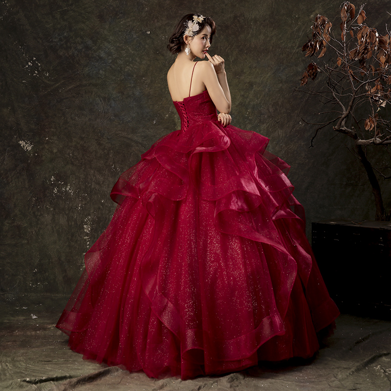 Wendyhouse spaghetti straps burgundy tulle quincerean dress with tiered skirt and lace up back.