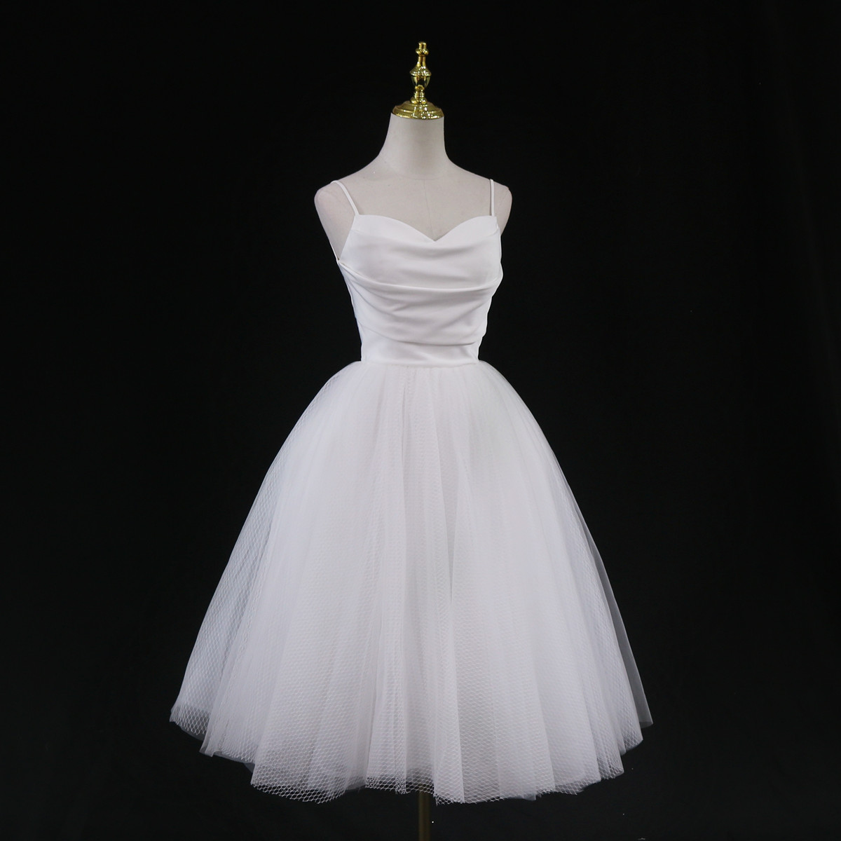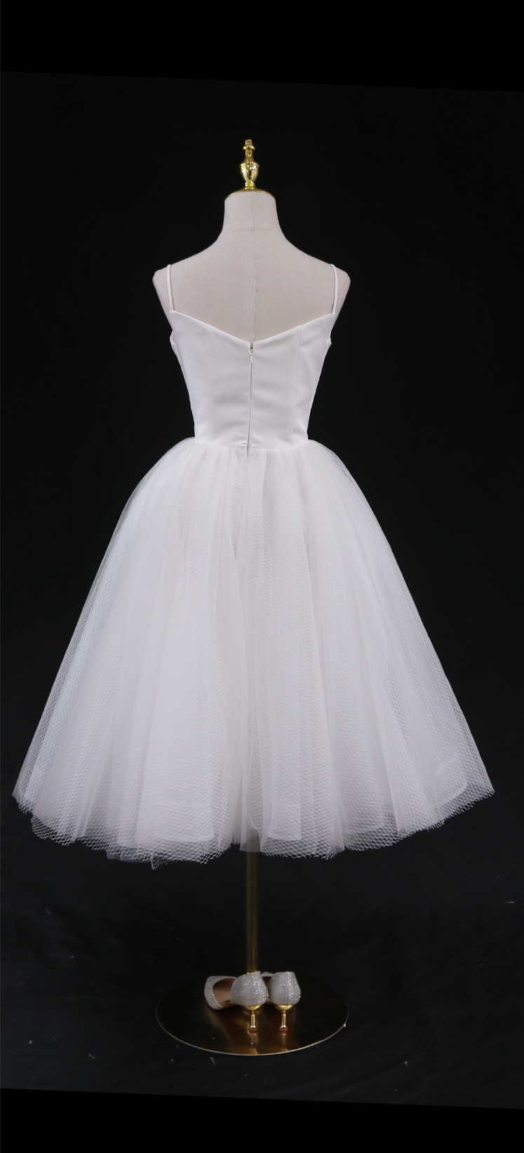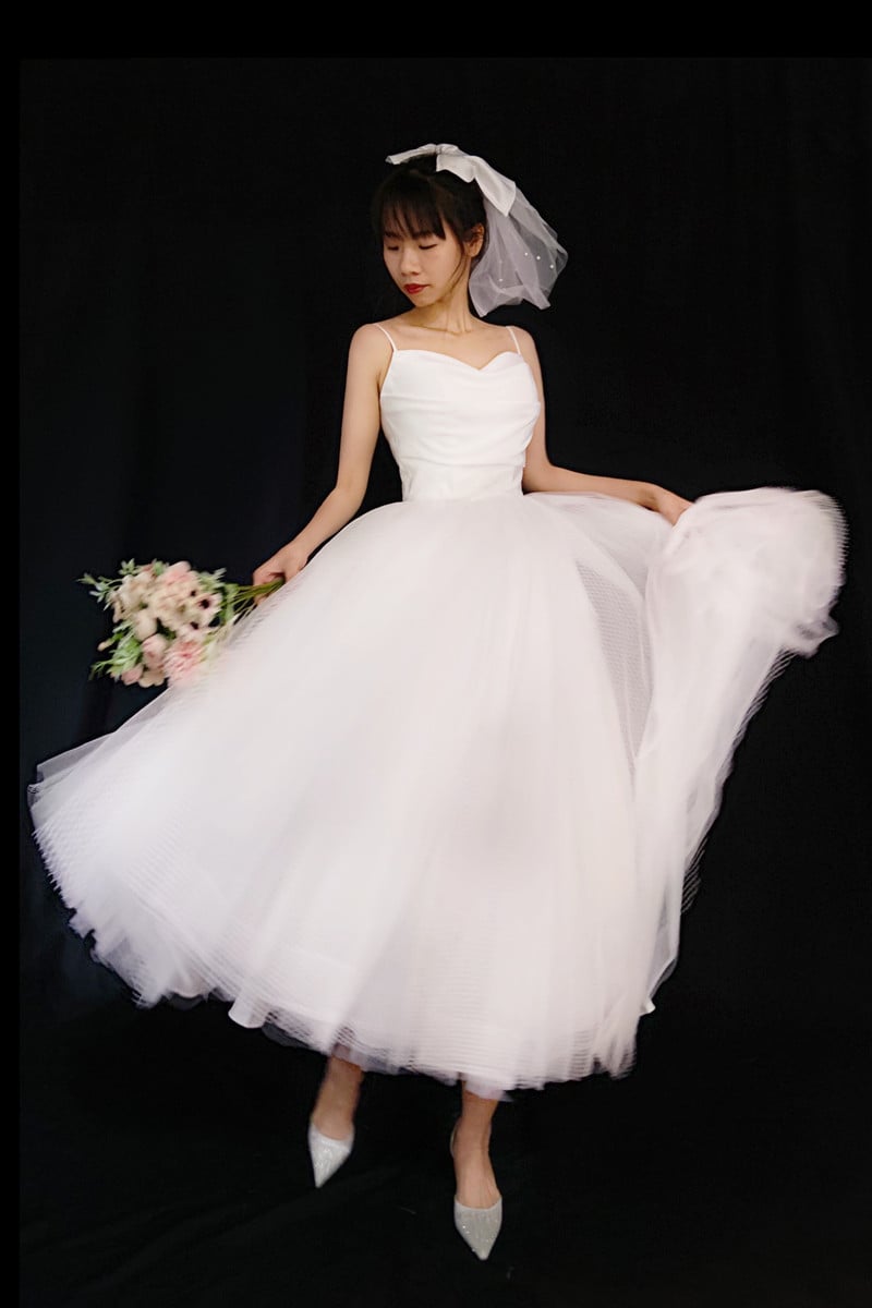 Wendyhouse vintage&casual style white midi length wedding dress features with spaghetti straps and tutu skirt. If you want the dress length shorter or longer, just contact me.