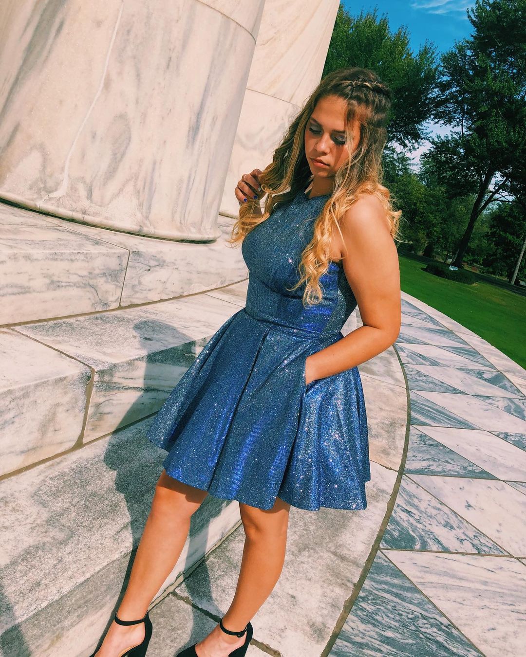 Wendyhouse navy blue A-line short homecoming dress with halter neckline and pockets inside.