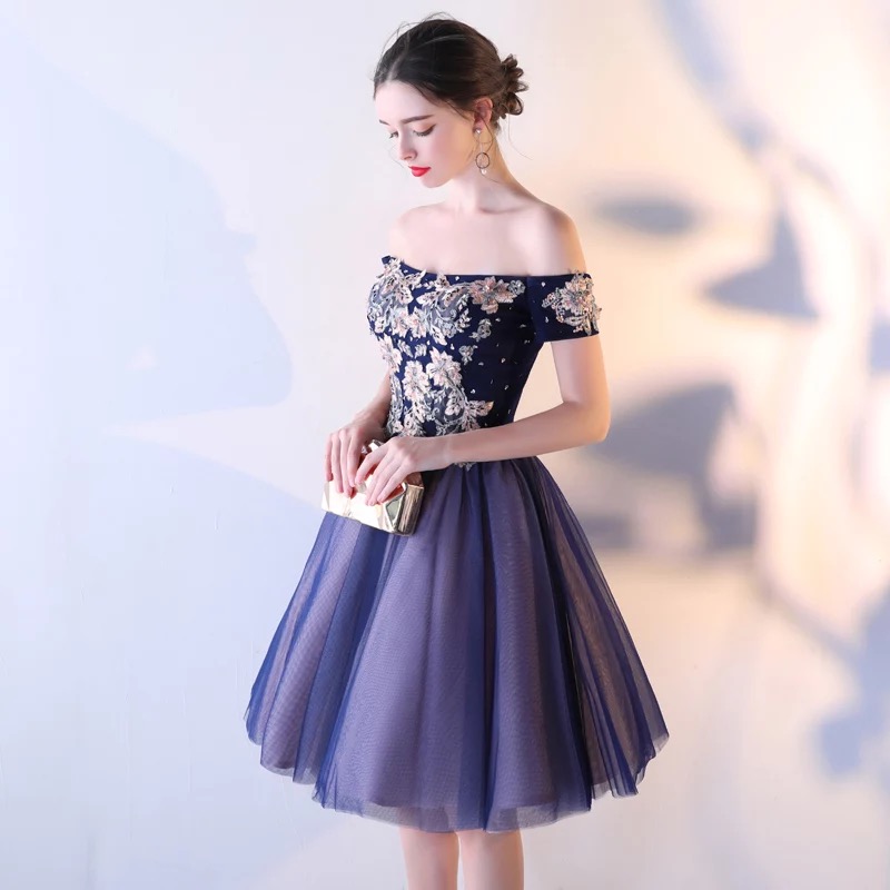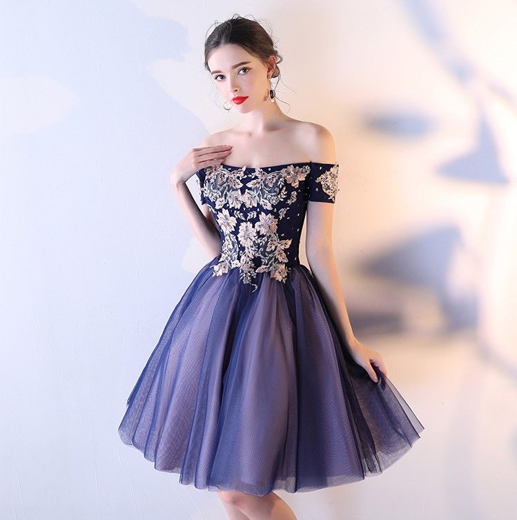 Off the Shoulder Navy Blue A-line Appliques Party Dress