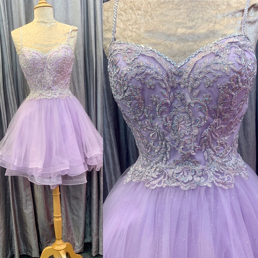 Wendyhouse lavender A-line short homecoming dress with beaded straps and beaded bodice.