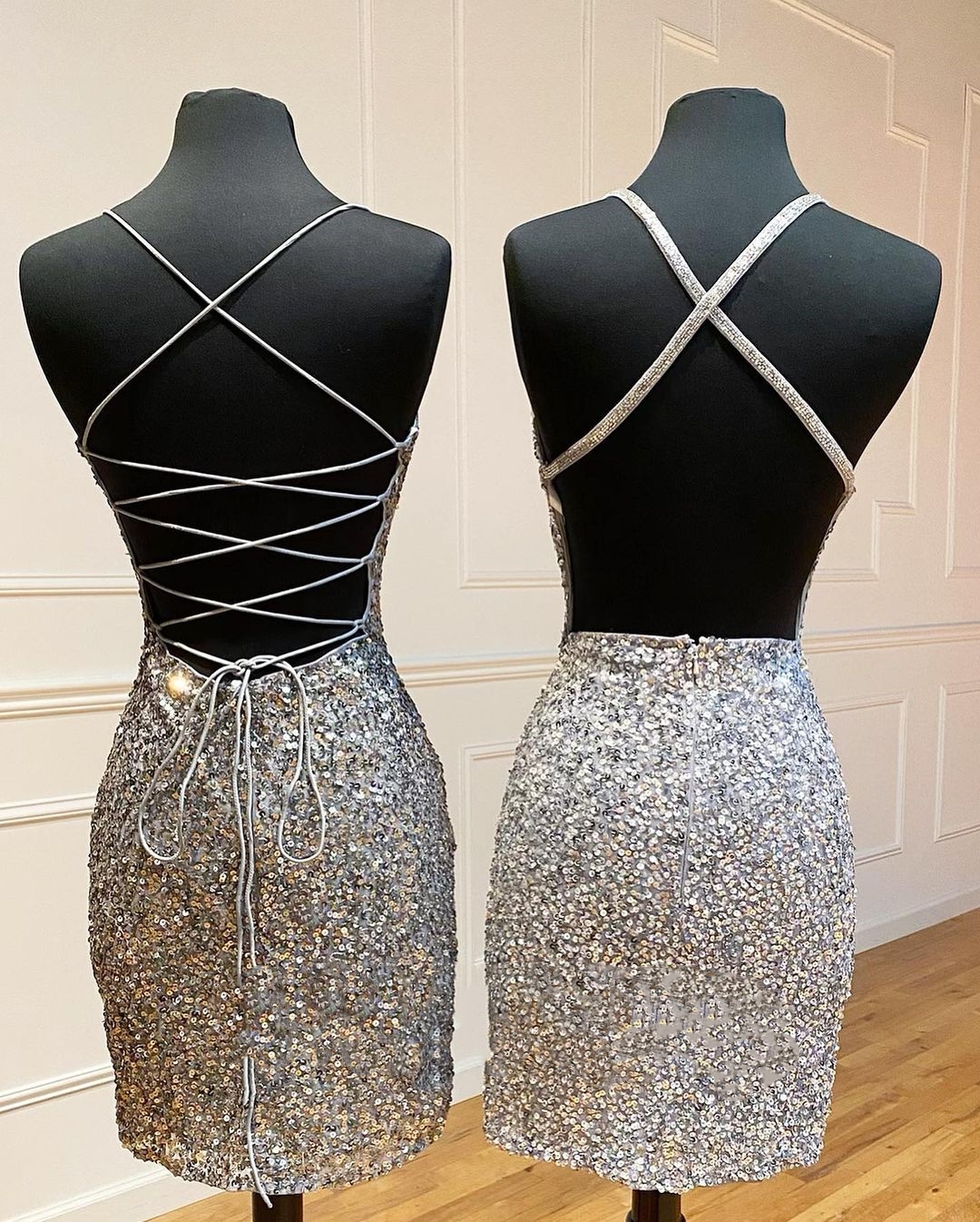 Wendyhouse spaghetti straps silver sequins bodycon mini dress with lace up back.