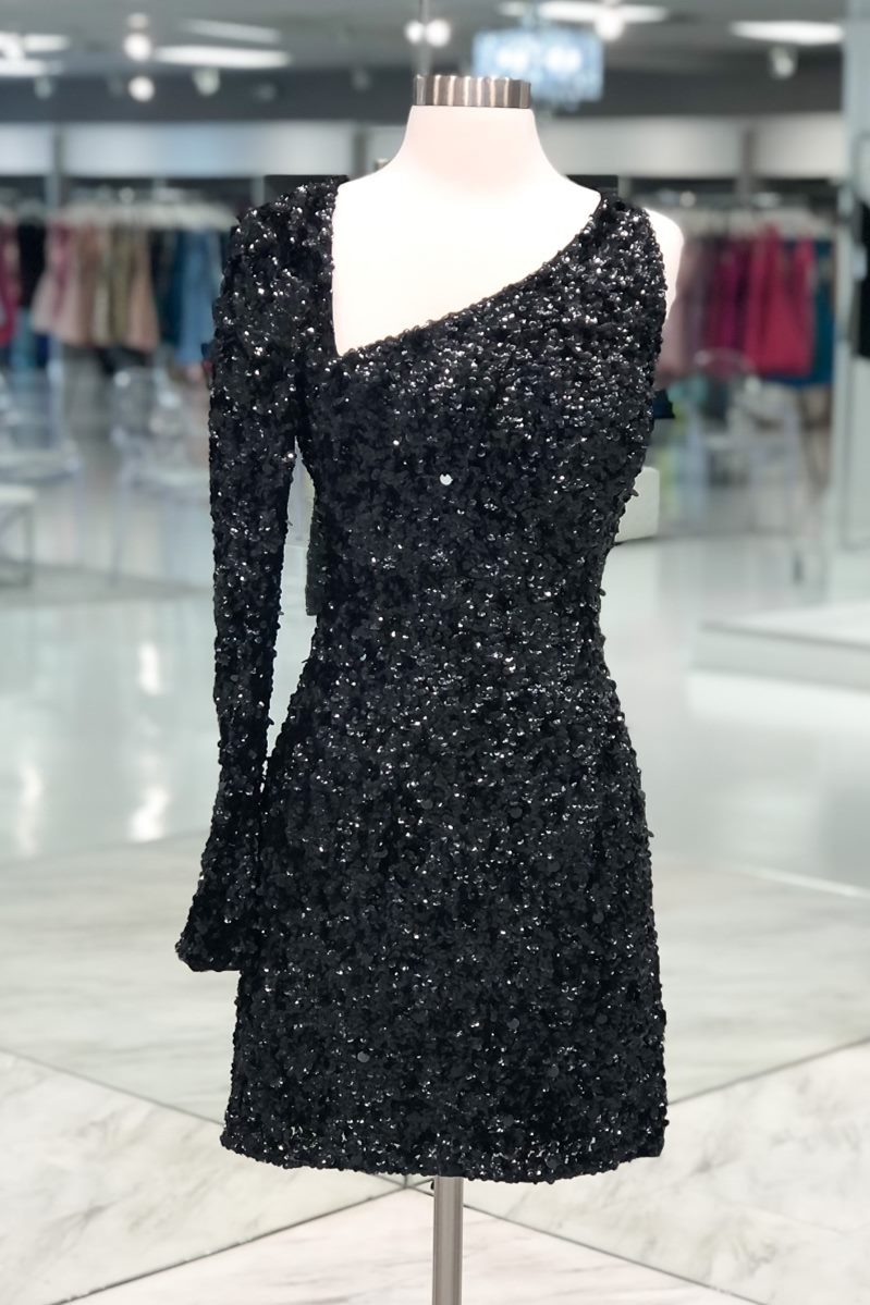 One Shoulder Long Sleeves Black Sequins Bodycon Dress