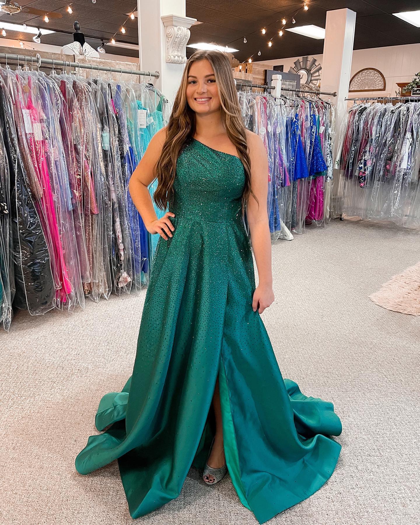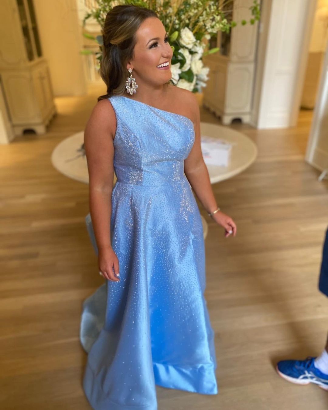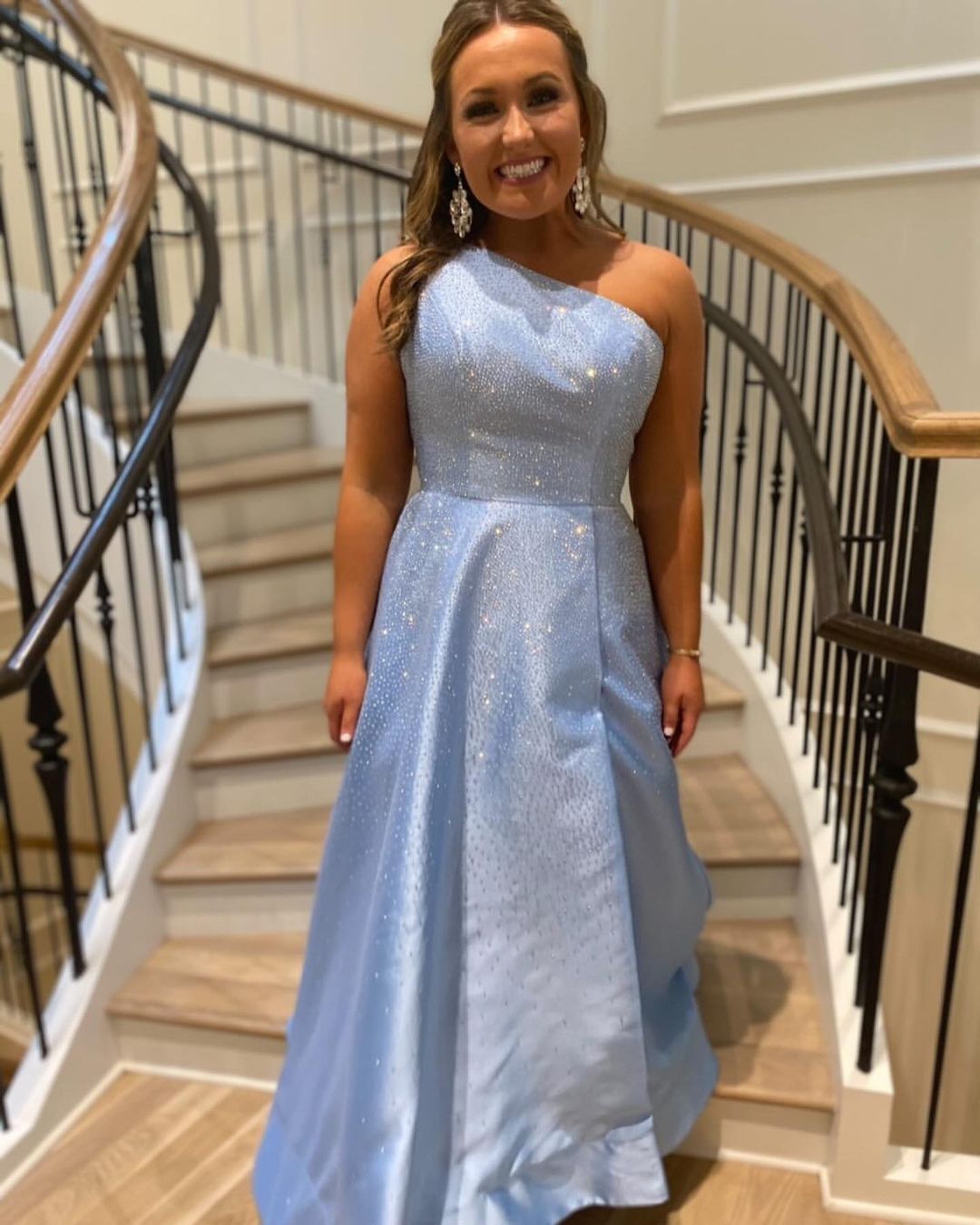 Wendyhouse elegant light blue long formal dress features with one shoulder and beads.
