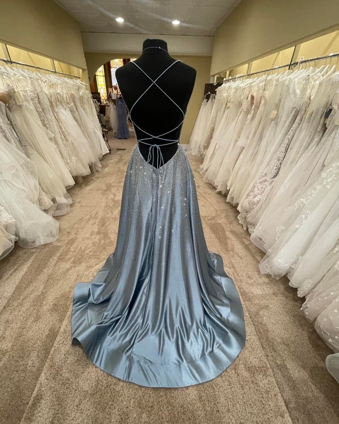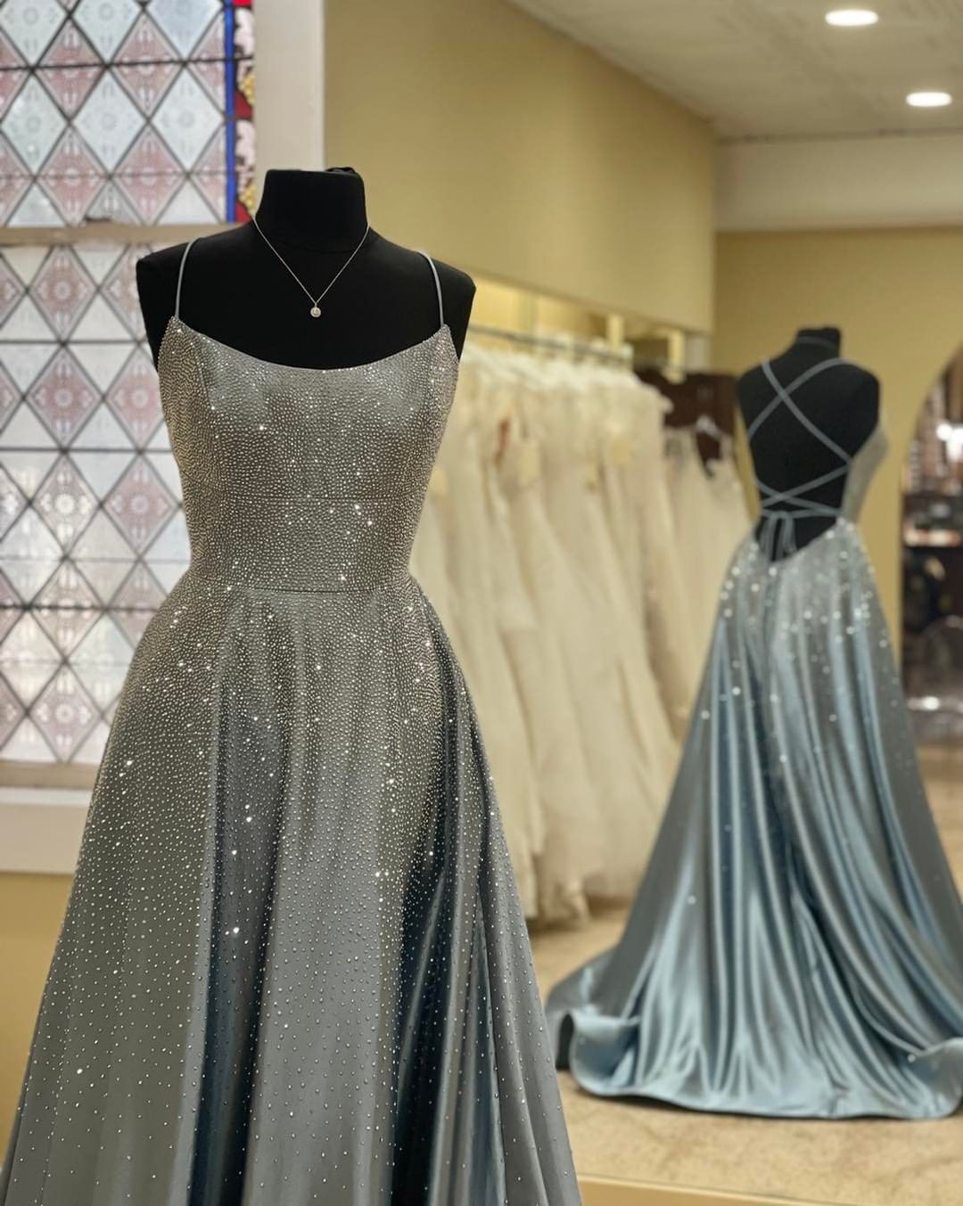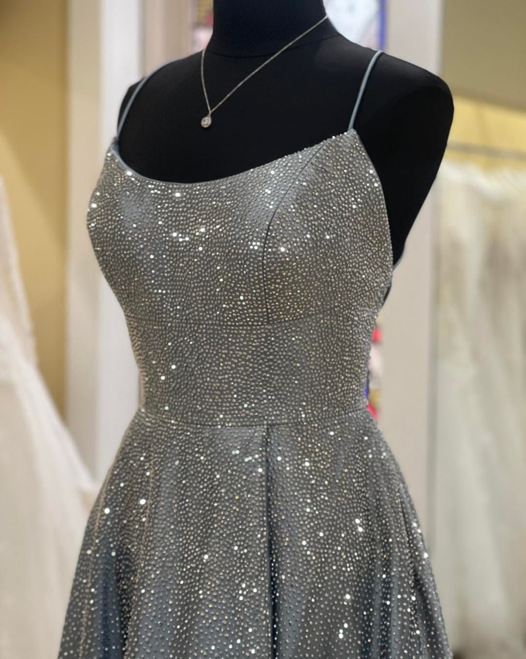 Elegant grey A-line long formal dress with spaghetti streaps, beads and lace up back.