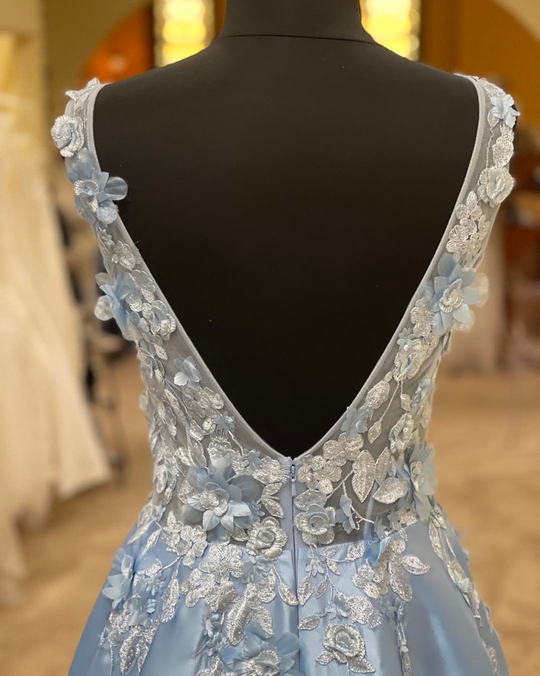 Princess blue A-line long prom dress with v neck see through bodice with 3D flowers and V Cut back.