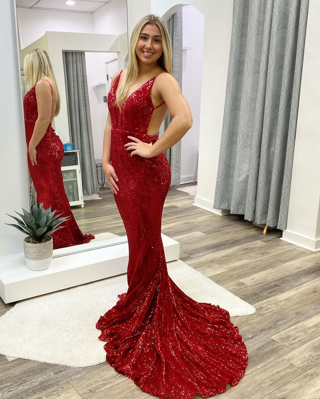 Gorgeous neon pink mermaid long formal dress is embellished with small beads, spaghetti straps, v neck, side slit and open back.