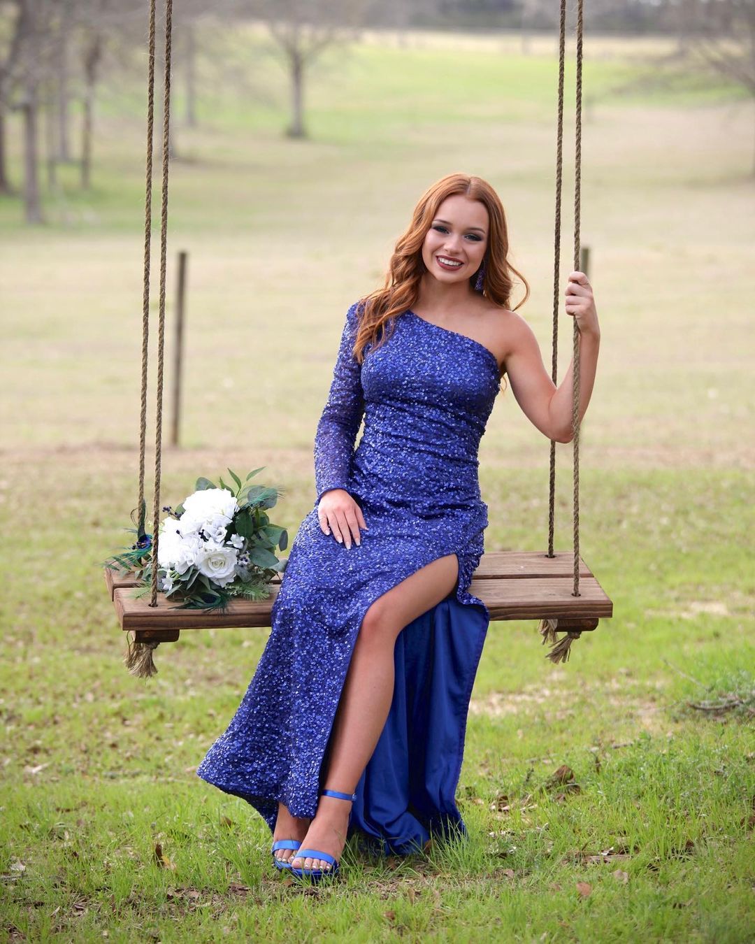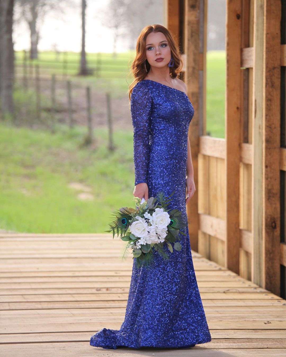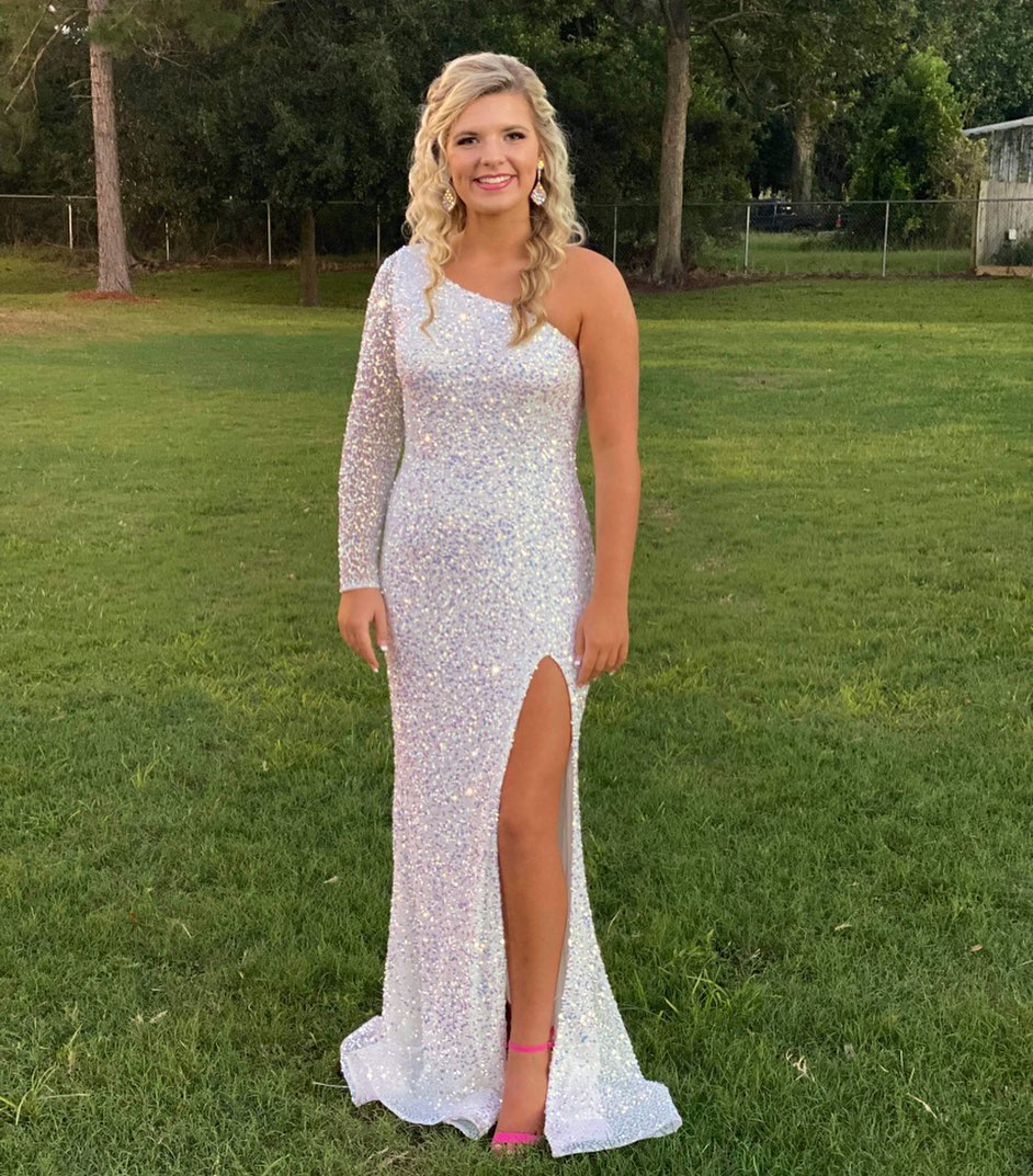 Stunning sequin mermaid long prom dress features one shoulder long sleeve, side slit and zip up back.