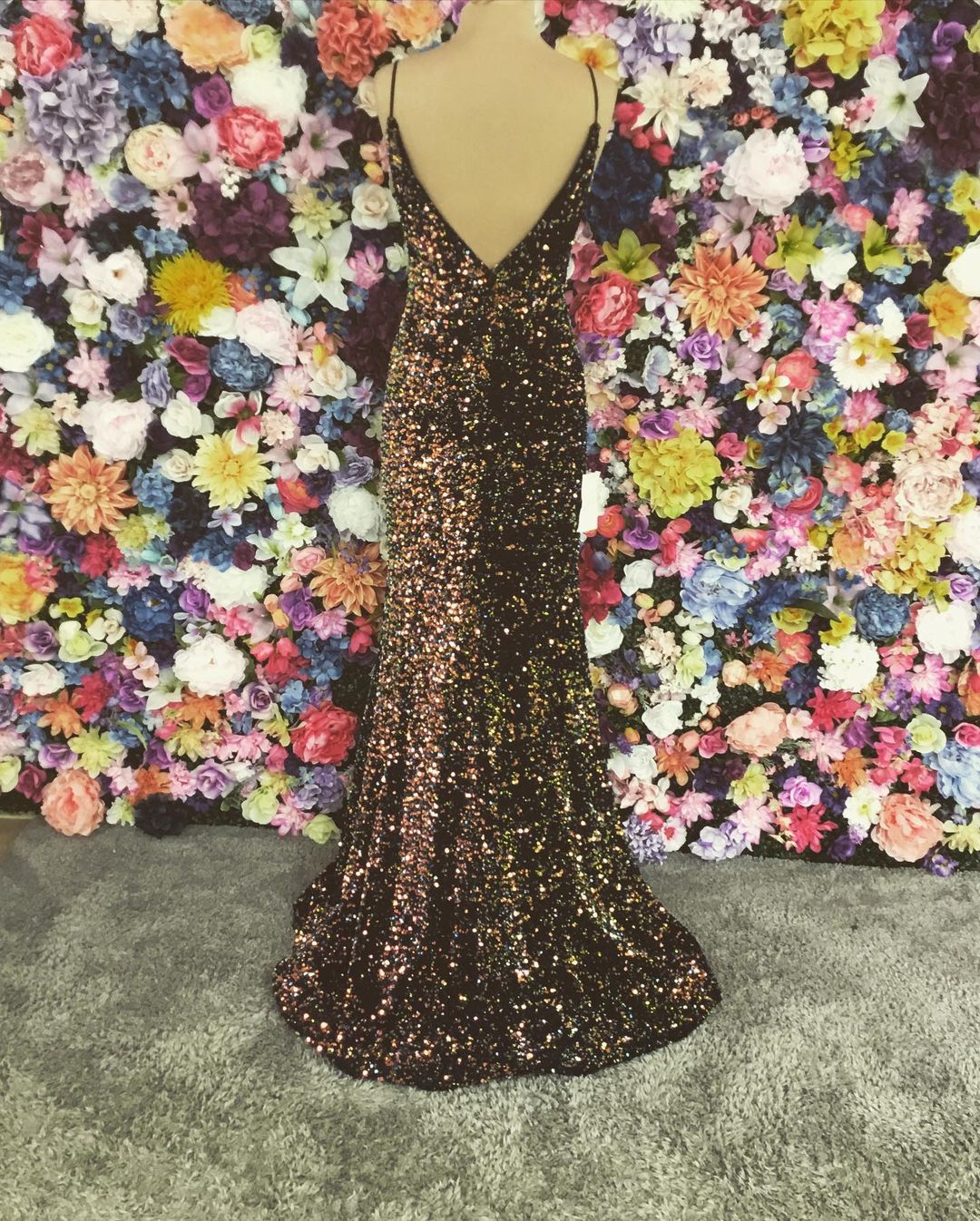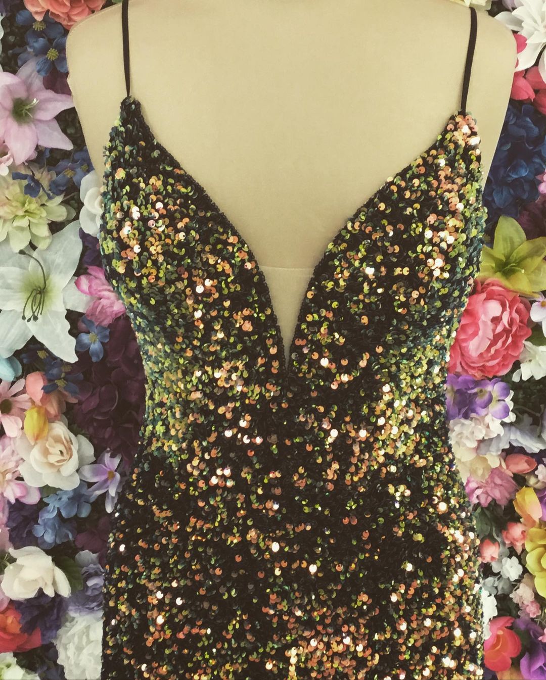 Gorgeous black sequin mermaid long prom dress features spaghetti straps, v neck and low back.