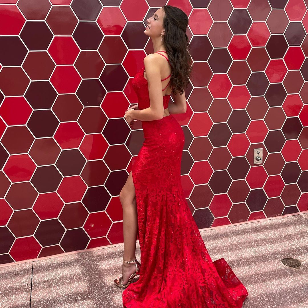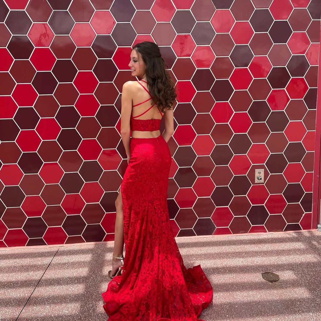 Two piece red lace long prom dress combines with v neck top and mermaid skirt with side slit.