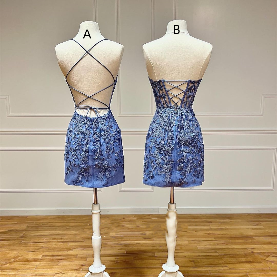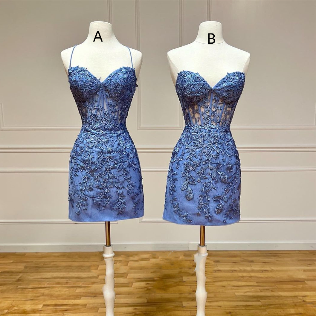 Elegant blue lace appliques bodycon mini party dress features strapless/spaghetti straps and lace up back.