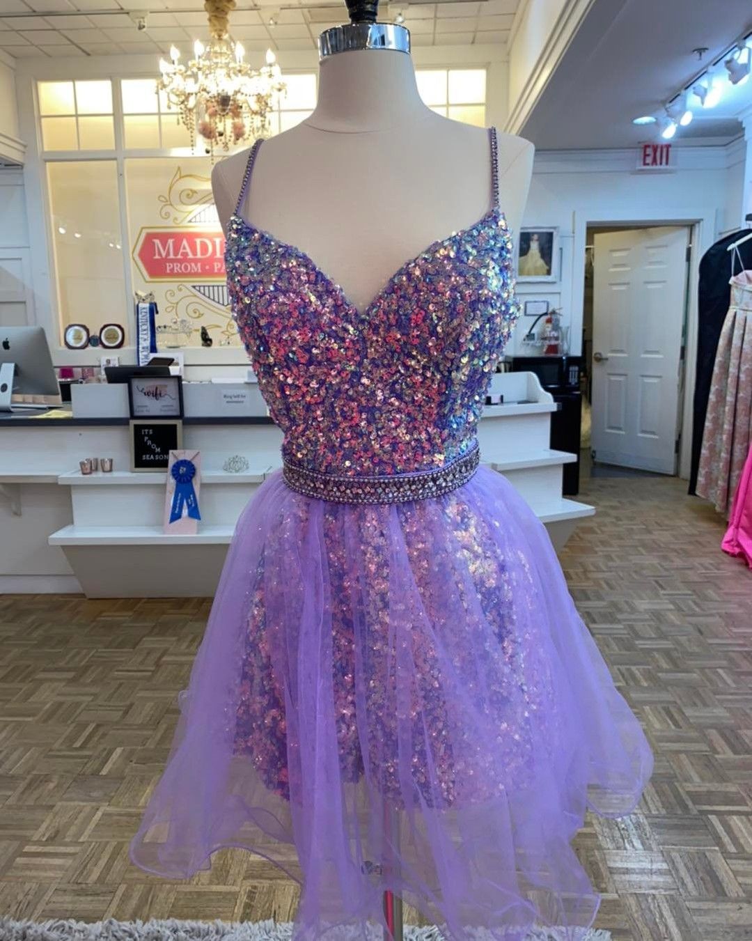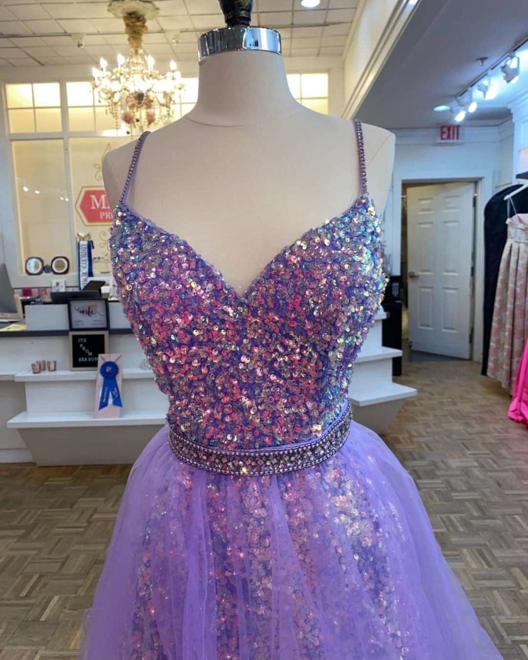 Sparkle purple sequin shorts with spaghetti straps and detachable train.