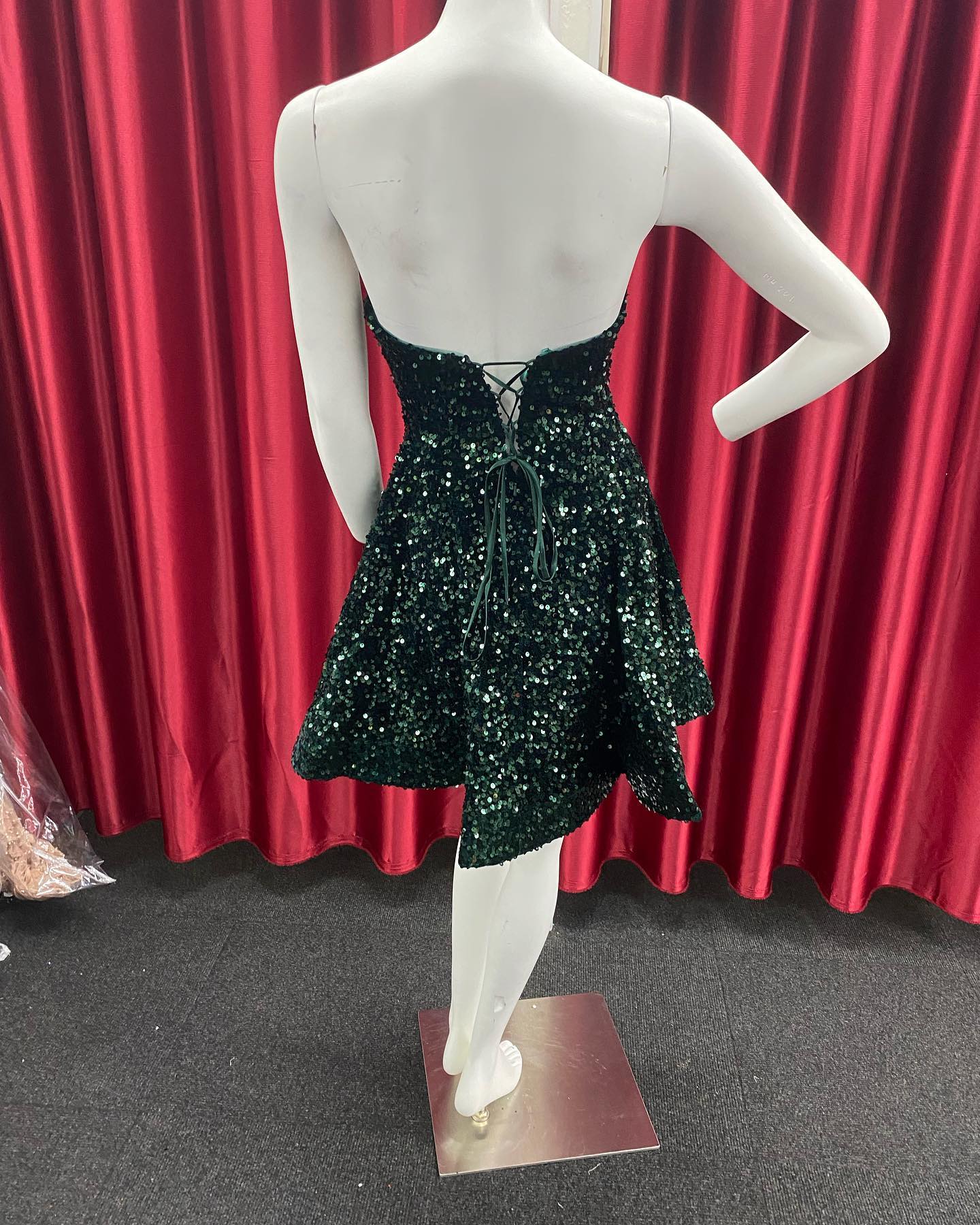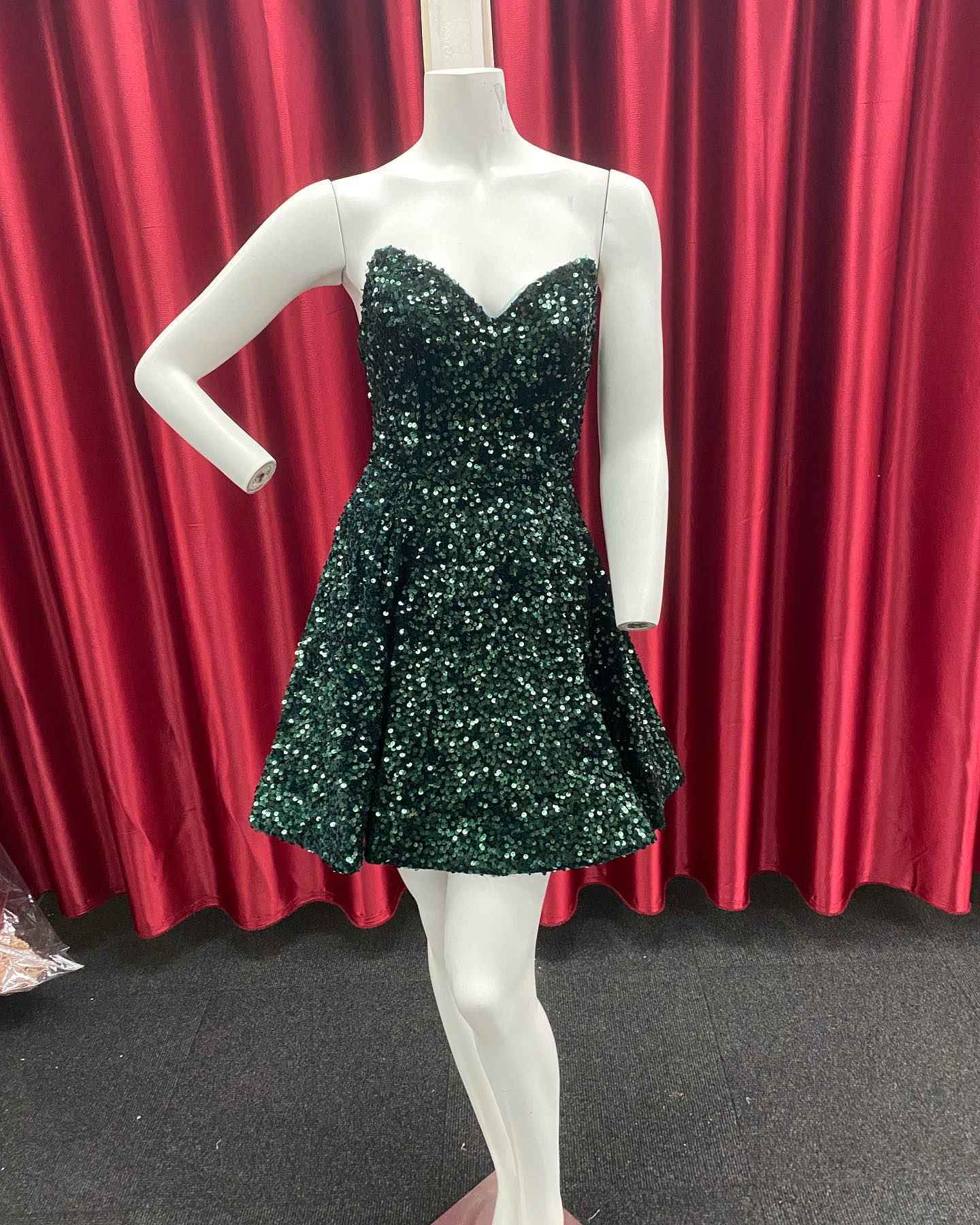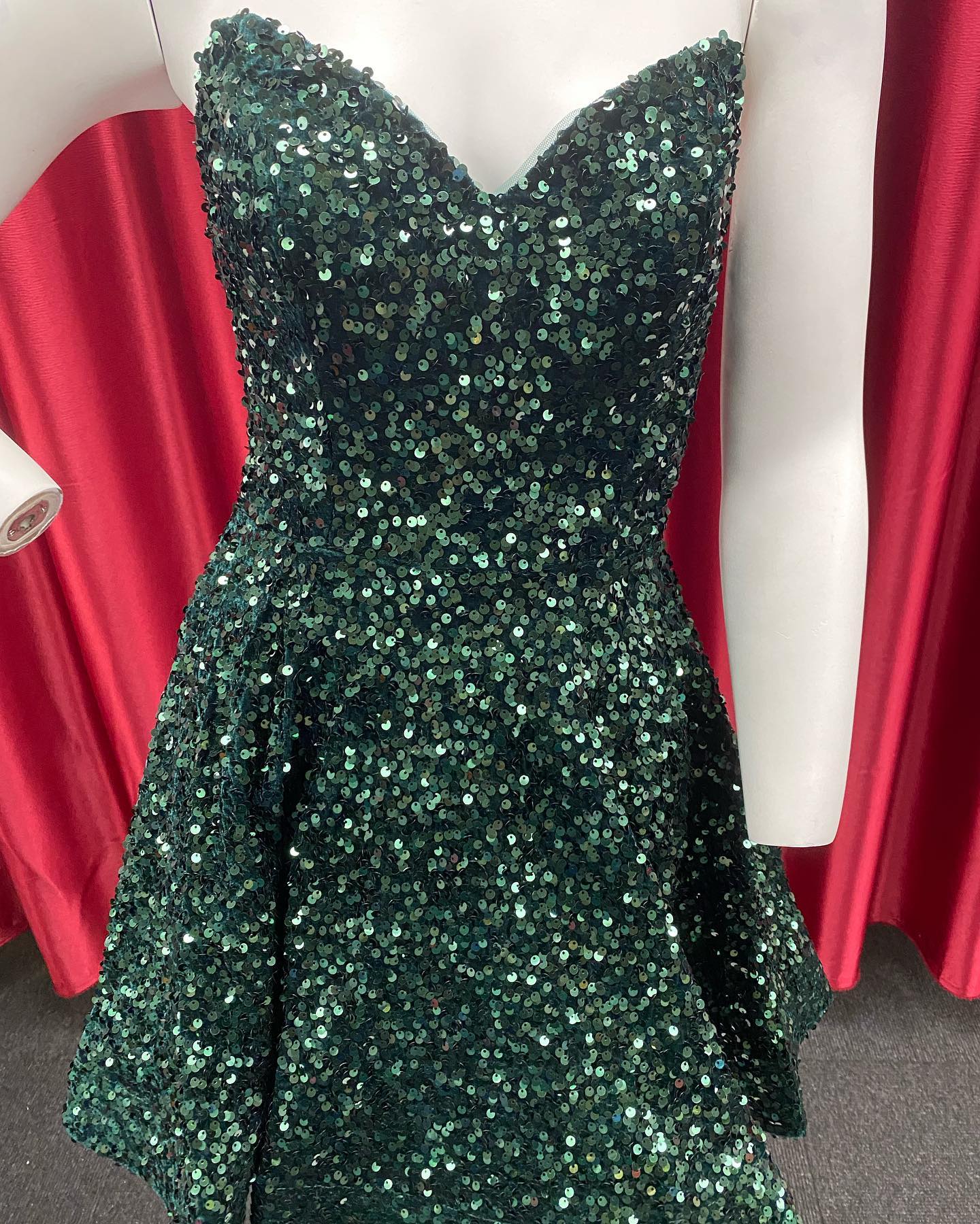 Sparkle dark green sequin A-line short party dress features strapless neck and zip up back.