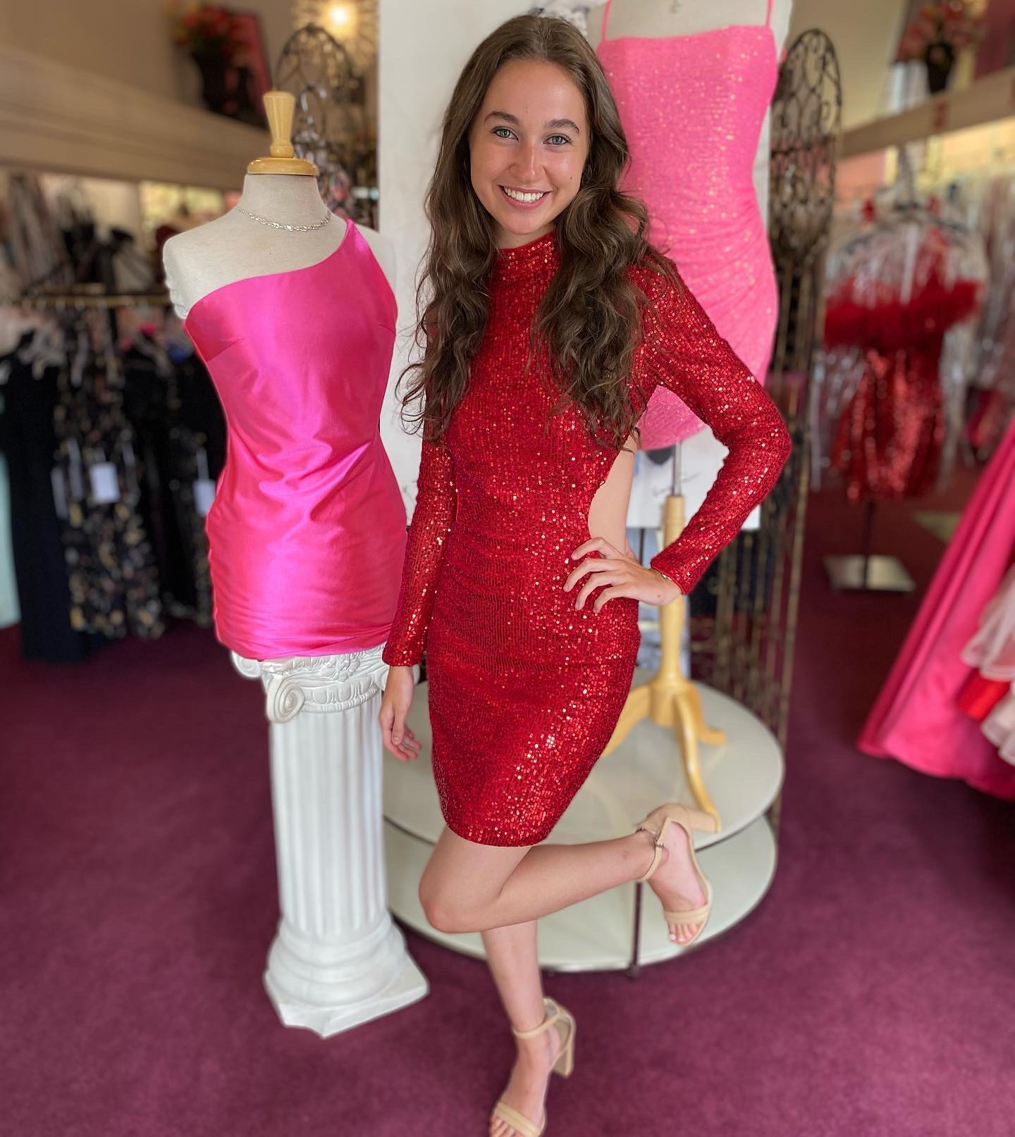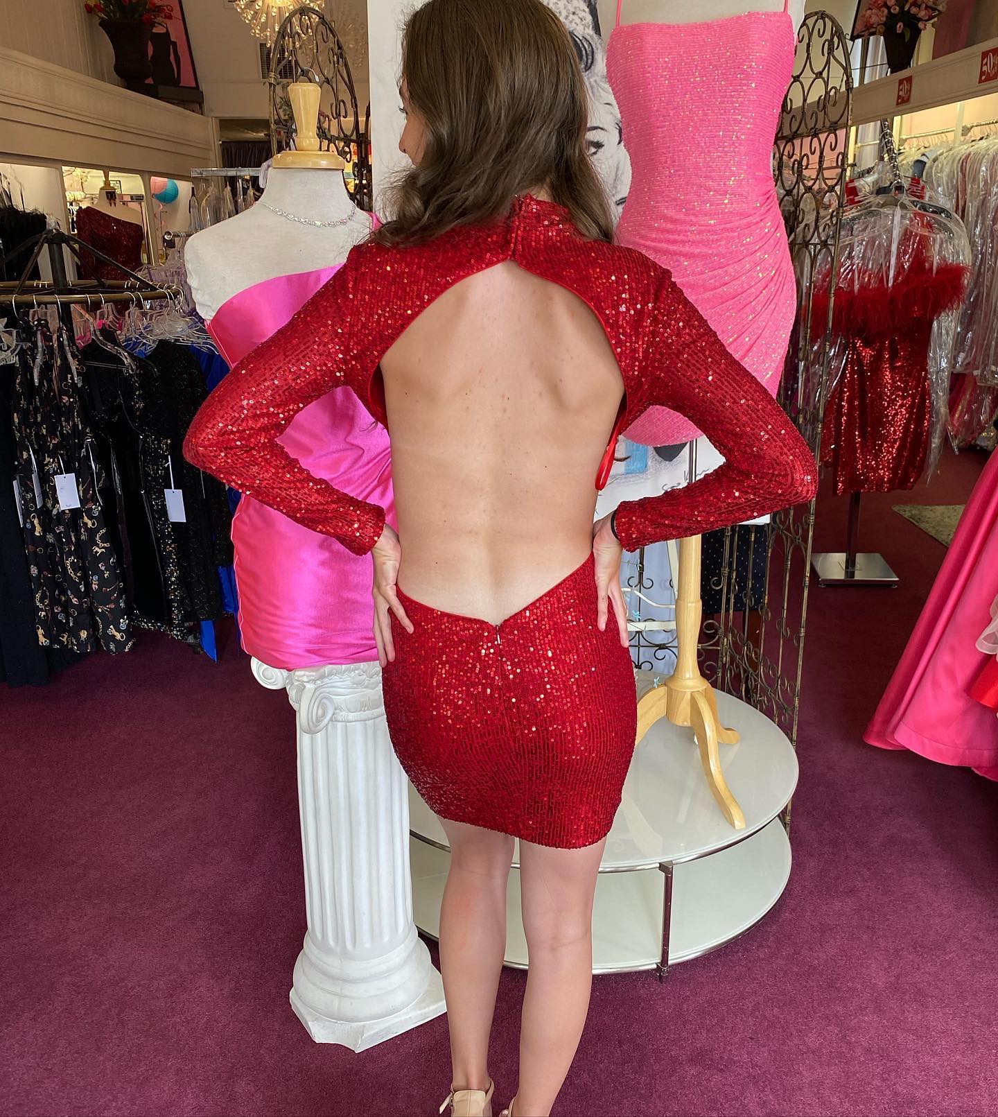 Gorgeous red sequin bodycon mini party dress features high neck, long sleeves and open back.