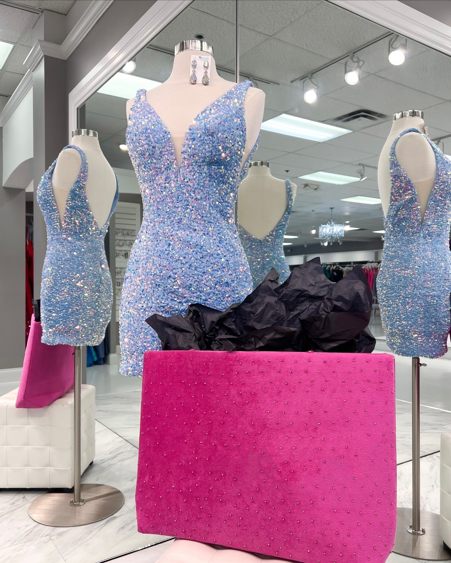 Sparkle light blue sequin bodycon mini dress features v neck and open back.