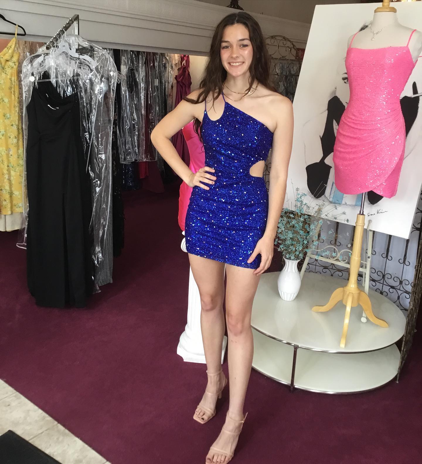 Sparkle royal blue sequin mini bodycon party dress features one shoulder and side cut out.