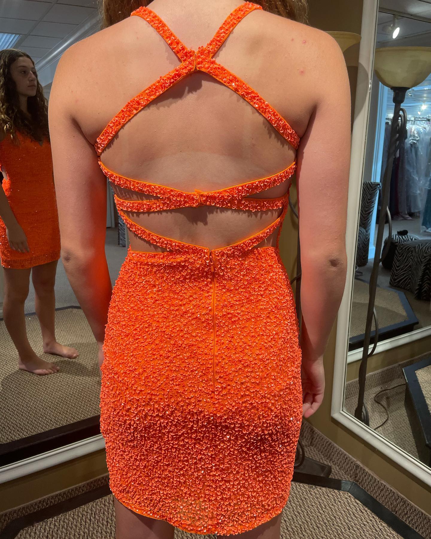 Glitters orange sequin tight homecoming dress features v neck and cross back.