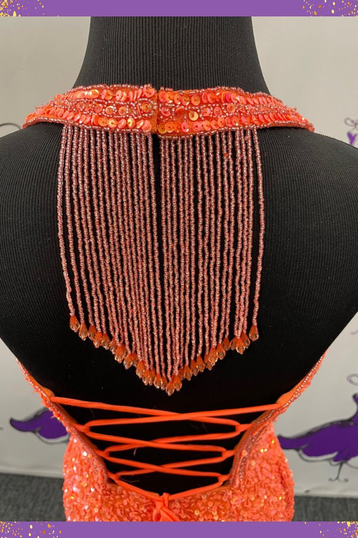 Sparkle orange sequin tight short homecoming dress features halter v neck, tassels and lace up back.