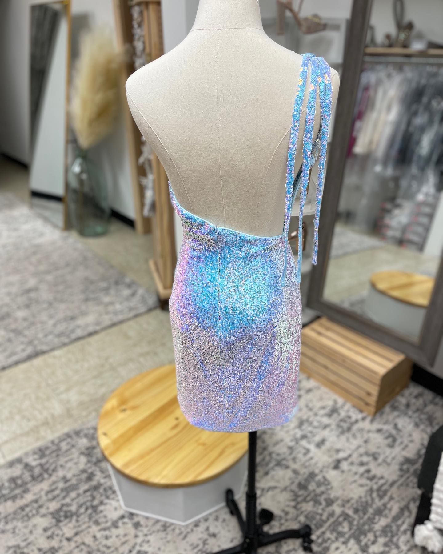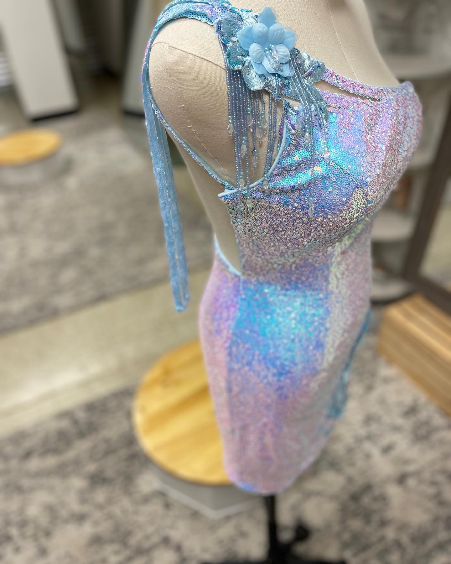 Stunning sequin bodycon mini homecoming dress features one shoulder, tassels, handmade flowers and open back.