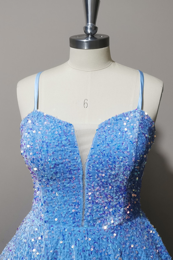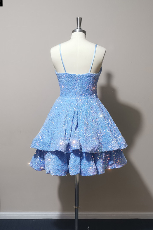 Glitters blue sequin A-line short homecoming dress features spaghetti straps, tiered skirt and zip up back.