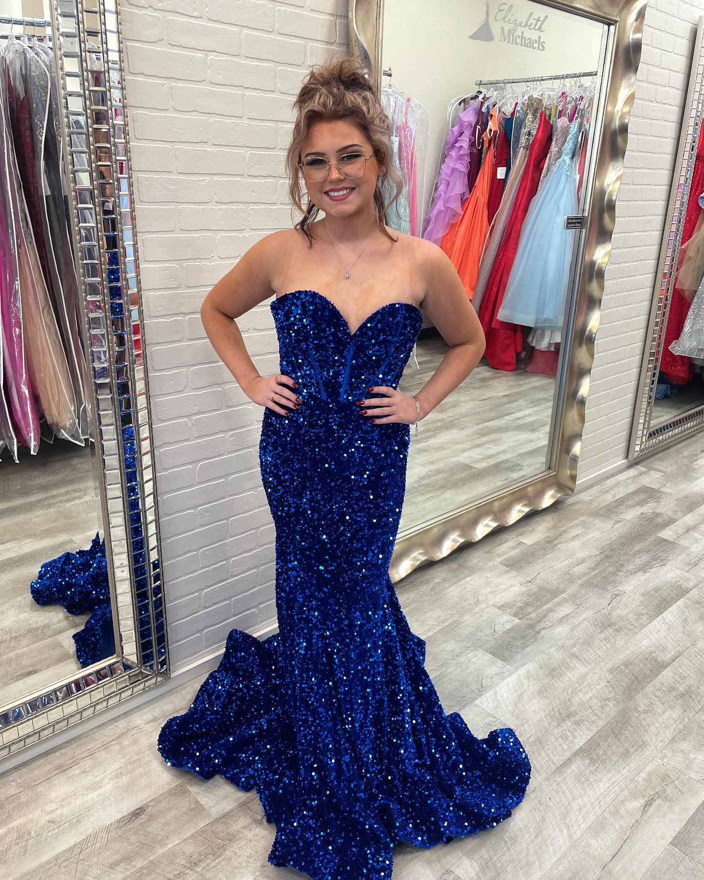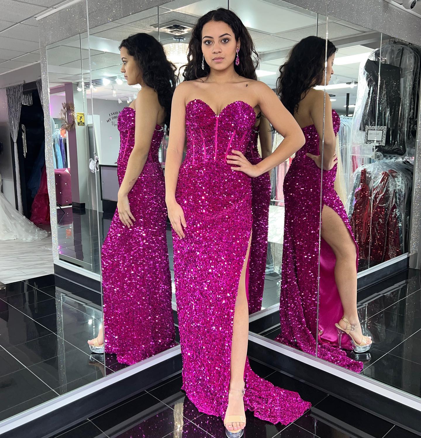 Sparkle fuchsia sequin mermaid long prom dress features sweetheart neck, side slit and zip up back.