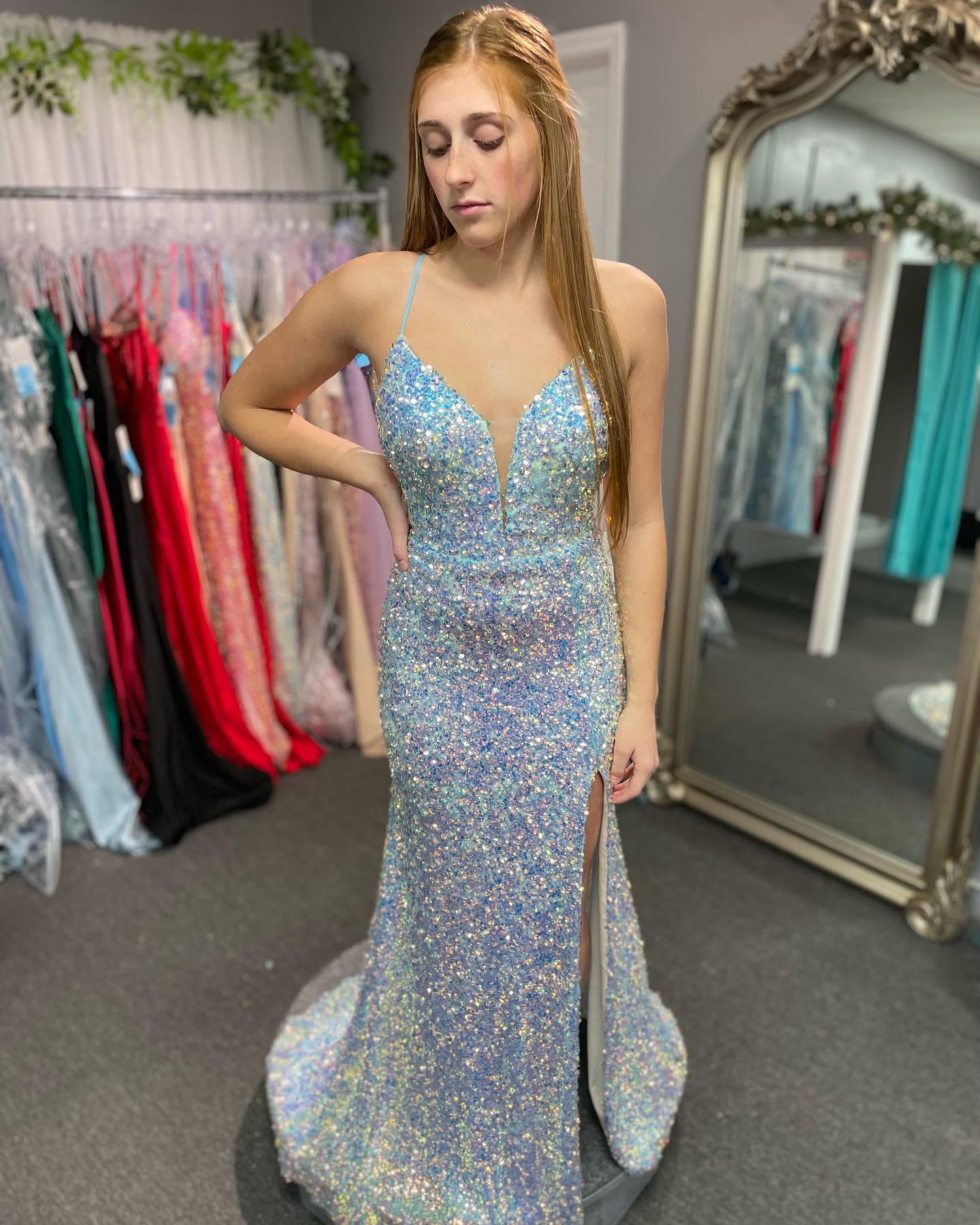 Sparkle blue sequin mermaid long prom dress features spaghetti straps, v neck with mesh insert, side slit and lace up back.