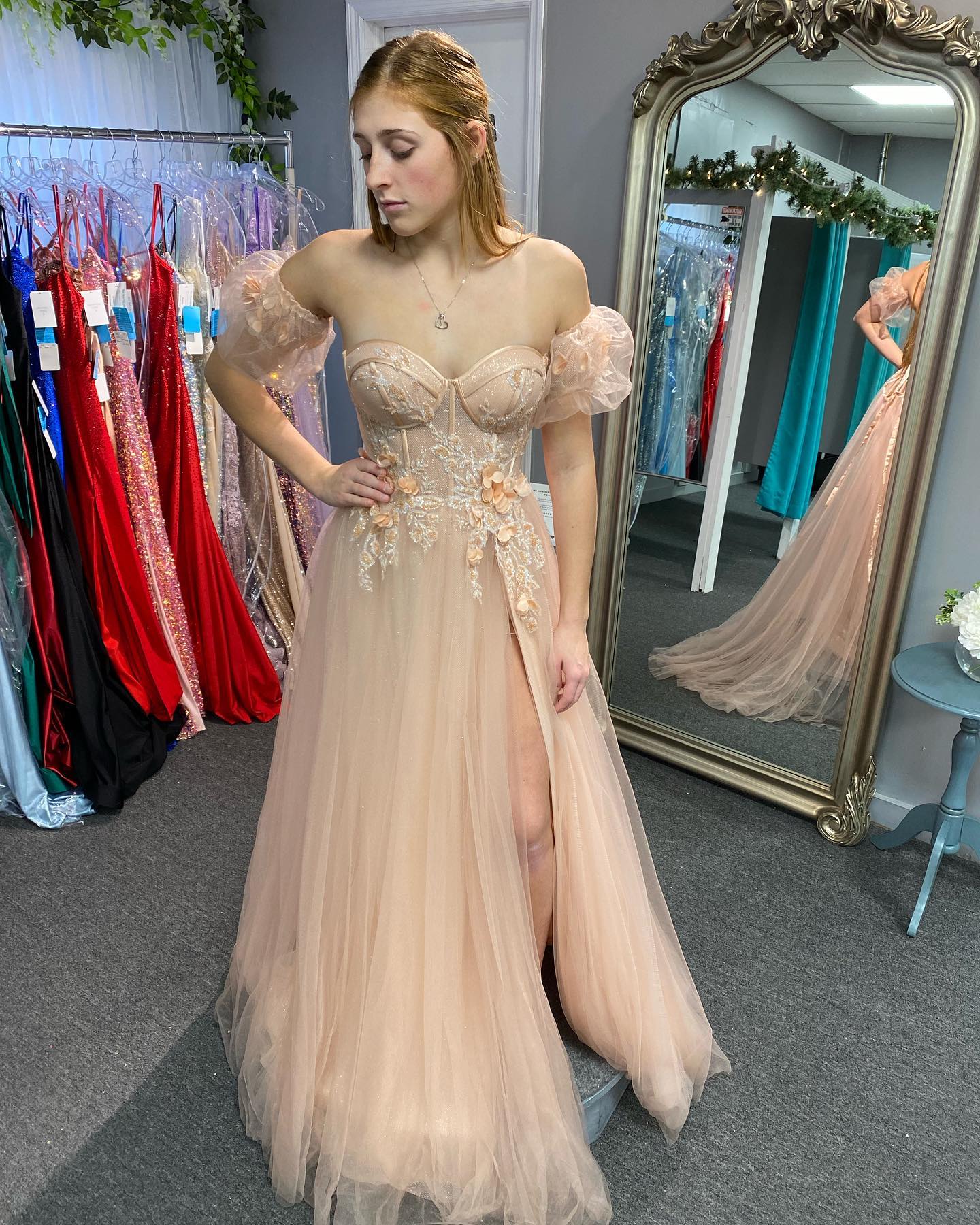Princess pink A-line long prom dress features sweehteart, flowers and short puffy sleeves.