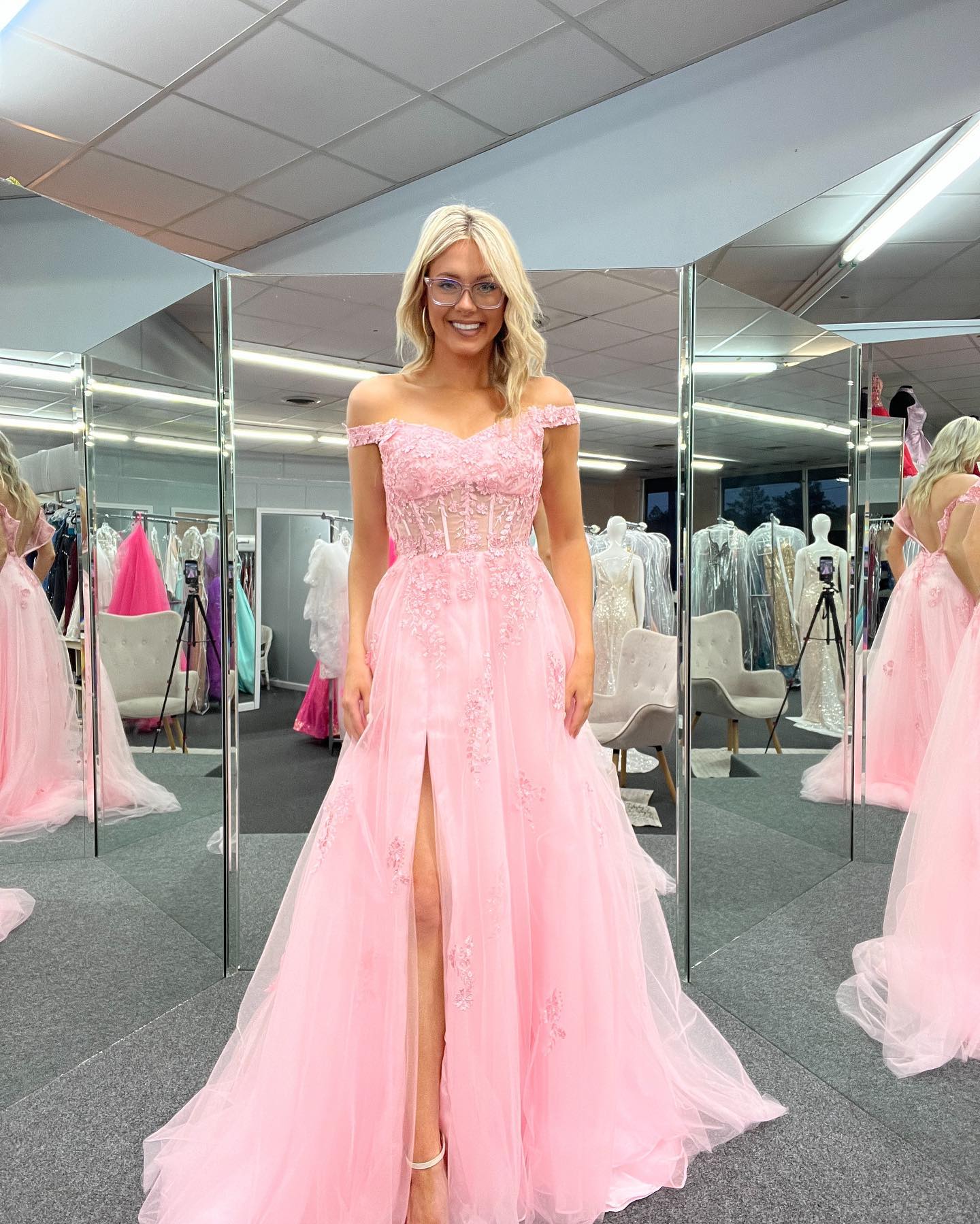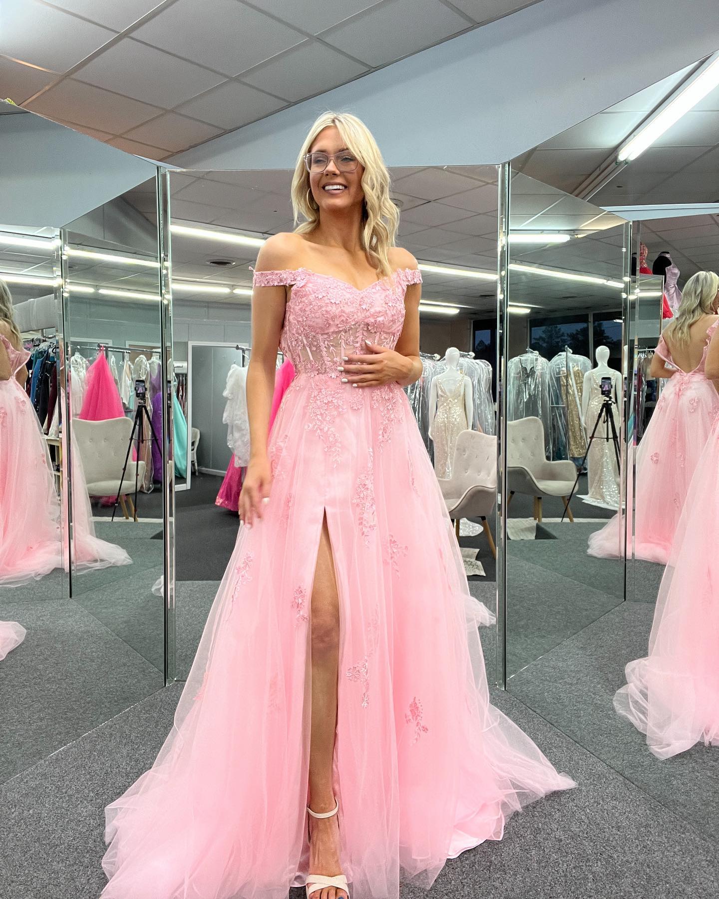 Elegant pink A-line long prom dress features off the shoulder, lace appliques, side slit and zip up back.
