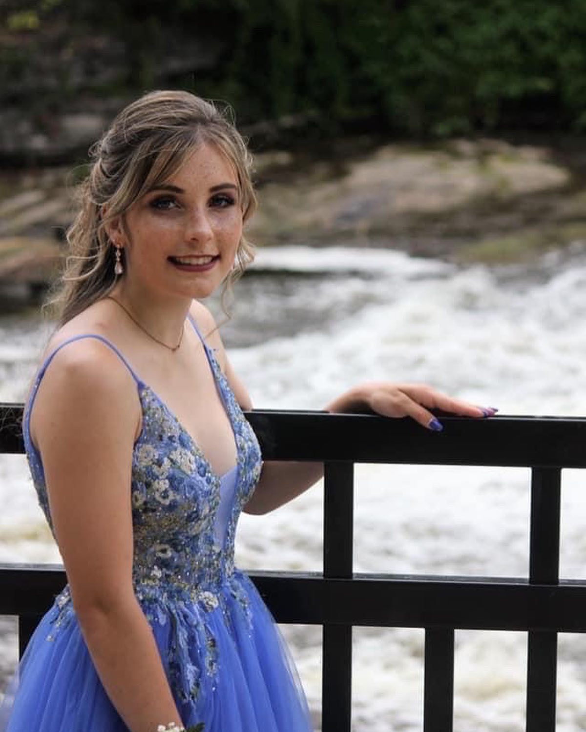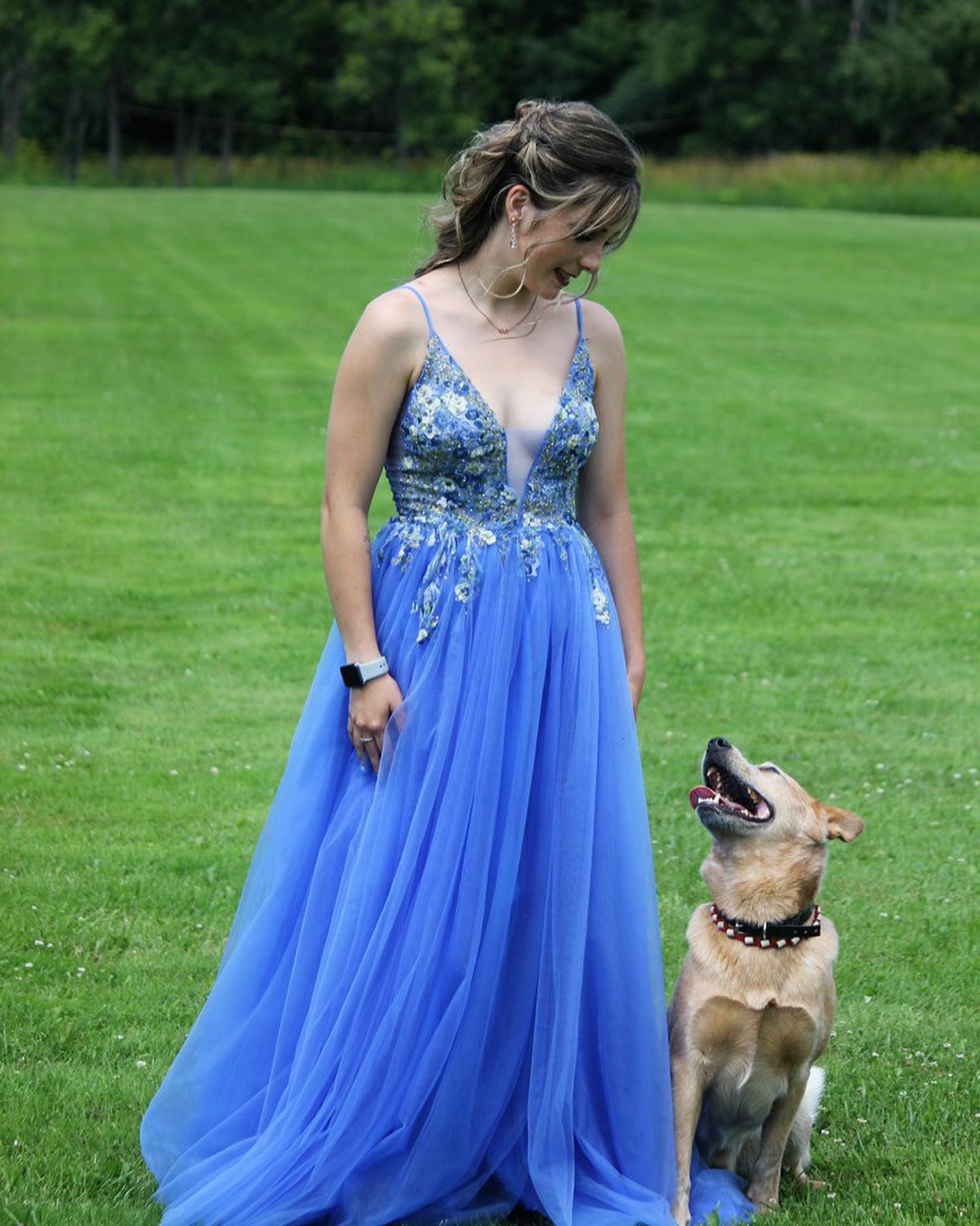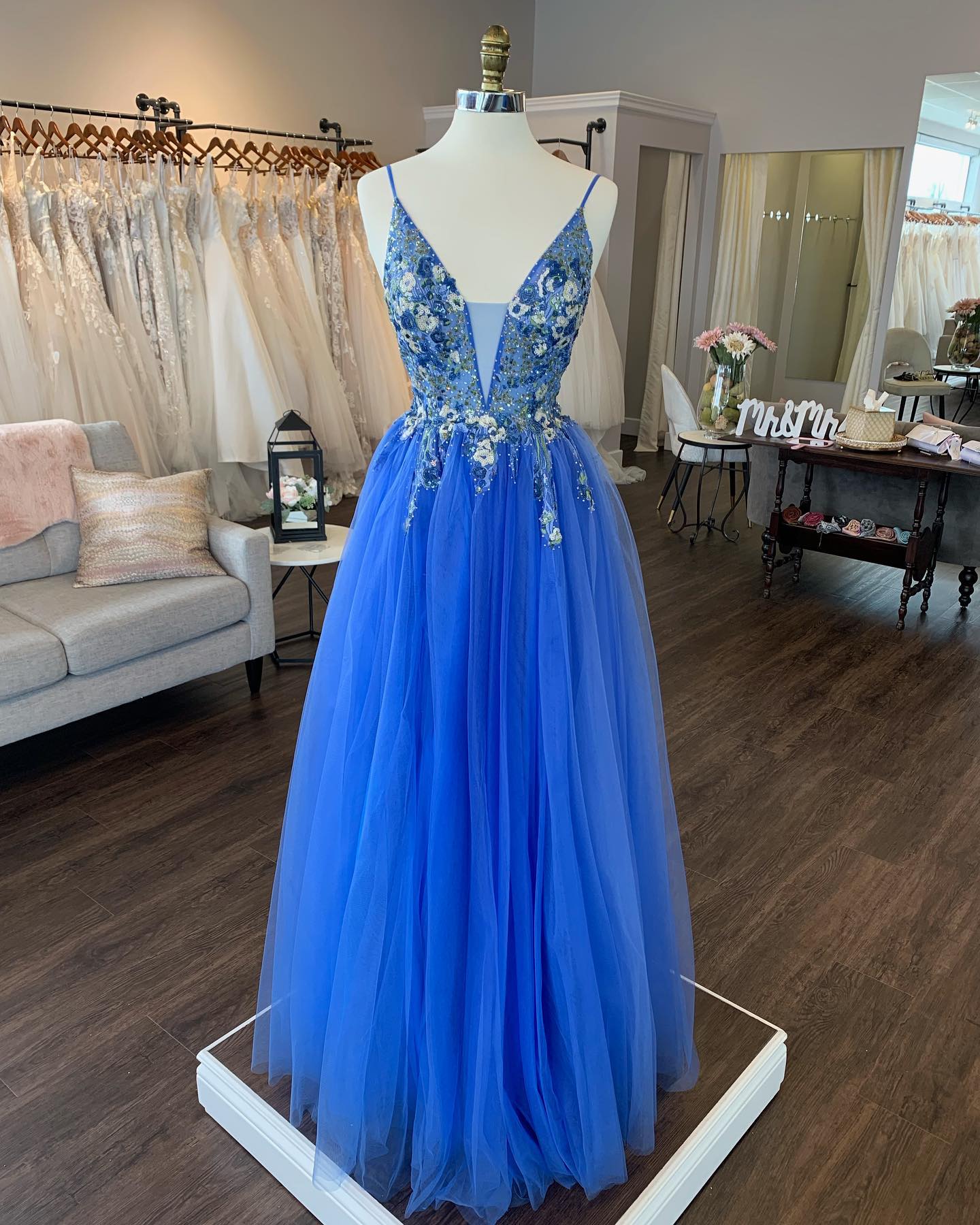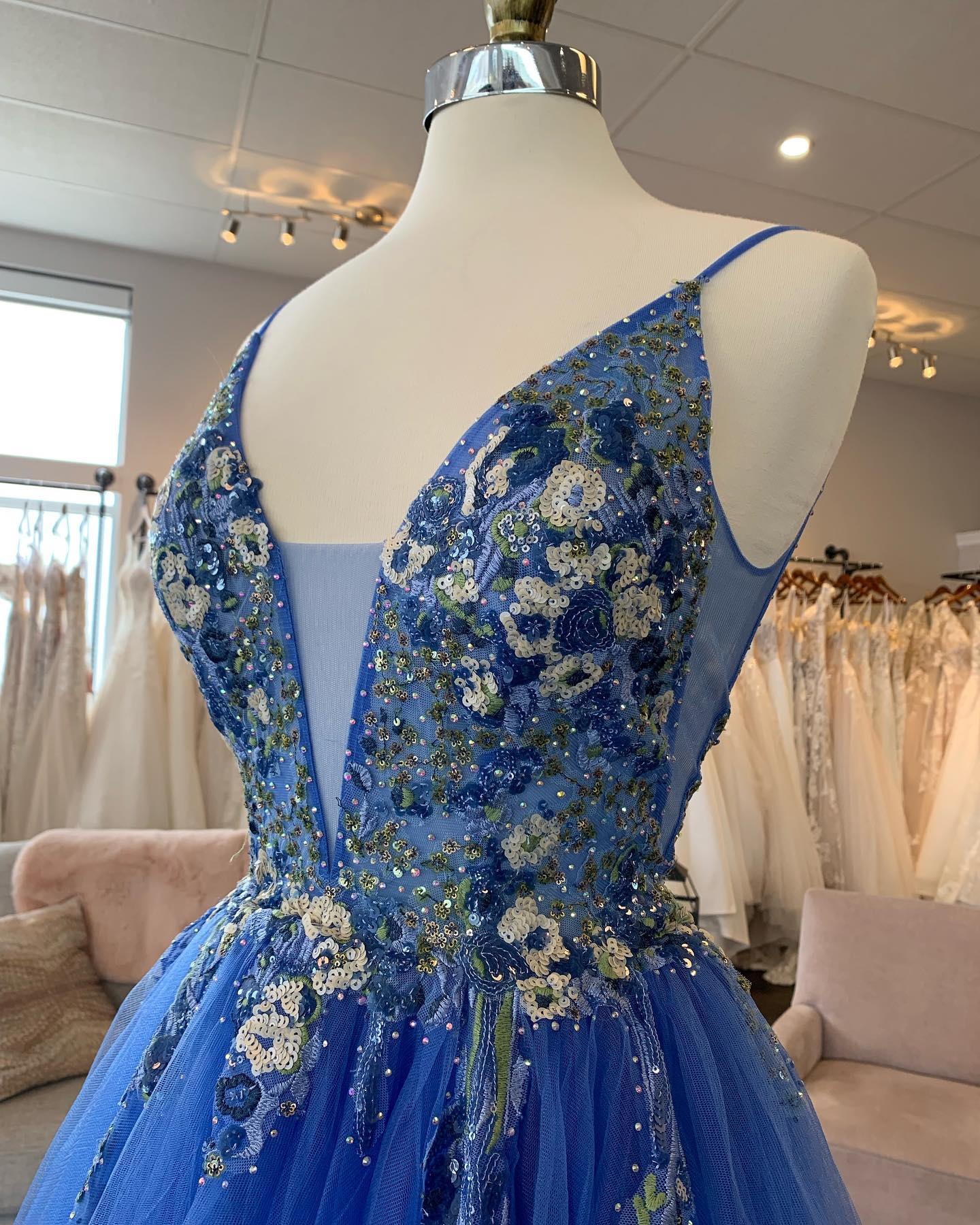 Princess blue A-line long prom dress features spaghetti straps, v neck, floral embroidered and open back.